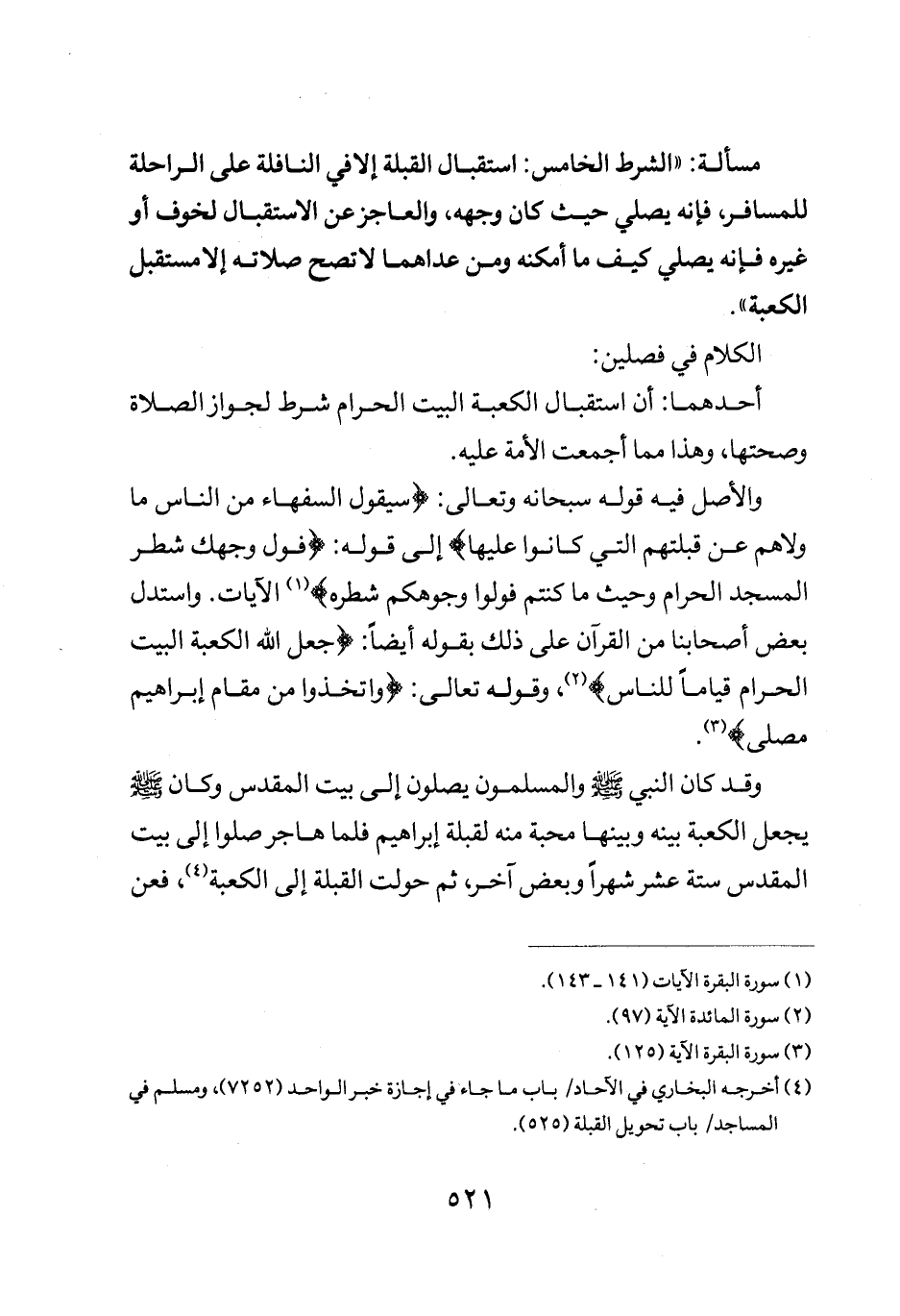 والأصل فيه قوله سبحانه وتعالى: {سَيَقُولُ السُّفَهَاءُ مِنَ النَّاسِ مَا وَلَّاهُمْ عَنْ قِبْلَتِهِمُ الَّتِي كَانُوا عَلَيْهَا} إلى قوله: {فَوَلِّ وَجْهَكَ شَطْرَ الْمَسْجِدِ الْحَرَامِ وَحَيْثُ مَا كُنْتُمْ فَوَلُّوا وُجُوهَكُمْ شَطْرَهُ} الآيات واستدل بعض أصحابنا من القران على ذلك بقوله أيضا: {جَعَلَ اللَّهُ الْكَعْبَةَ الْبَيْتَ الْحَرَامَ قِيَاماً لِلنَّاسِ} وقوله تعالى: {وَاتَّخِذُوا مِنْ مَقَامِ إبراهيم مُصَلّىً}.