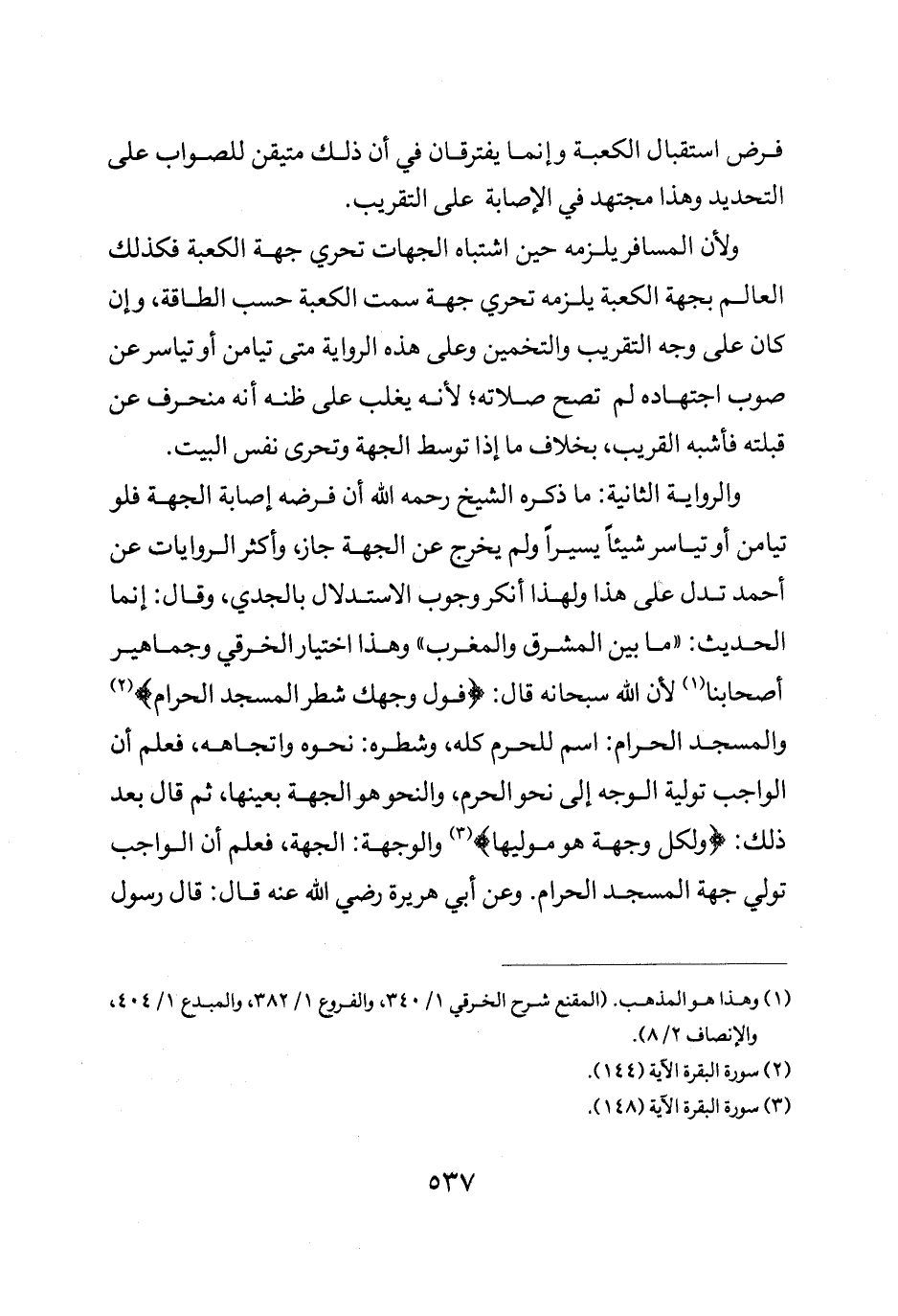 والرواية الثانية: ما ذكره الشيخ رحمه الله أن فرضه اصابة الجهة فلو تيامن أو تياسر شيئا يسيرا ولم يخرج عن الجهة جاز وأكثر الروايات عن أحمد تدل على هذا ولهذا أنكر وجوب الاستدلال بالجدي وقال إنما الحديث ما بين المشرق والمغرب وهذا اختيار الخرقي وجماهير أصحابنا لأن الله سبحانه قال: {فَوَلِّ وَجْهَكَ شَطْرَ الْمَسْجِدِ الْحَرَامِ} والمسجد الحرام اسم للحرم كله وشطره نحوه واتجاهه فعلم أن الواجب تولية الوجه إلى نحو الحرم والنحو هو الجهة بعينها ثم قال بعد ذلك {وَلِكُلٍّ وِجْهَةٌ هُوَ مُوَلِّيهَا} والوجهة الجهة فعلم أن الواجب تولي جهة المسجد الحرام وعن أبي هريرة رضي الله عنه قال: قال رسول