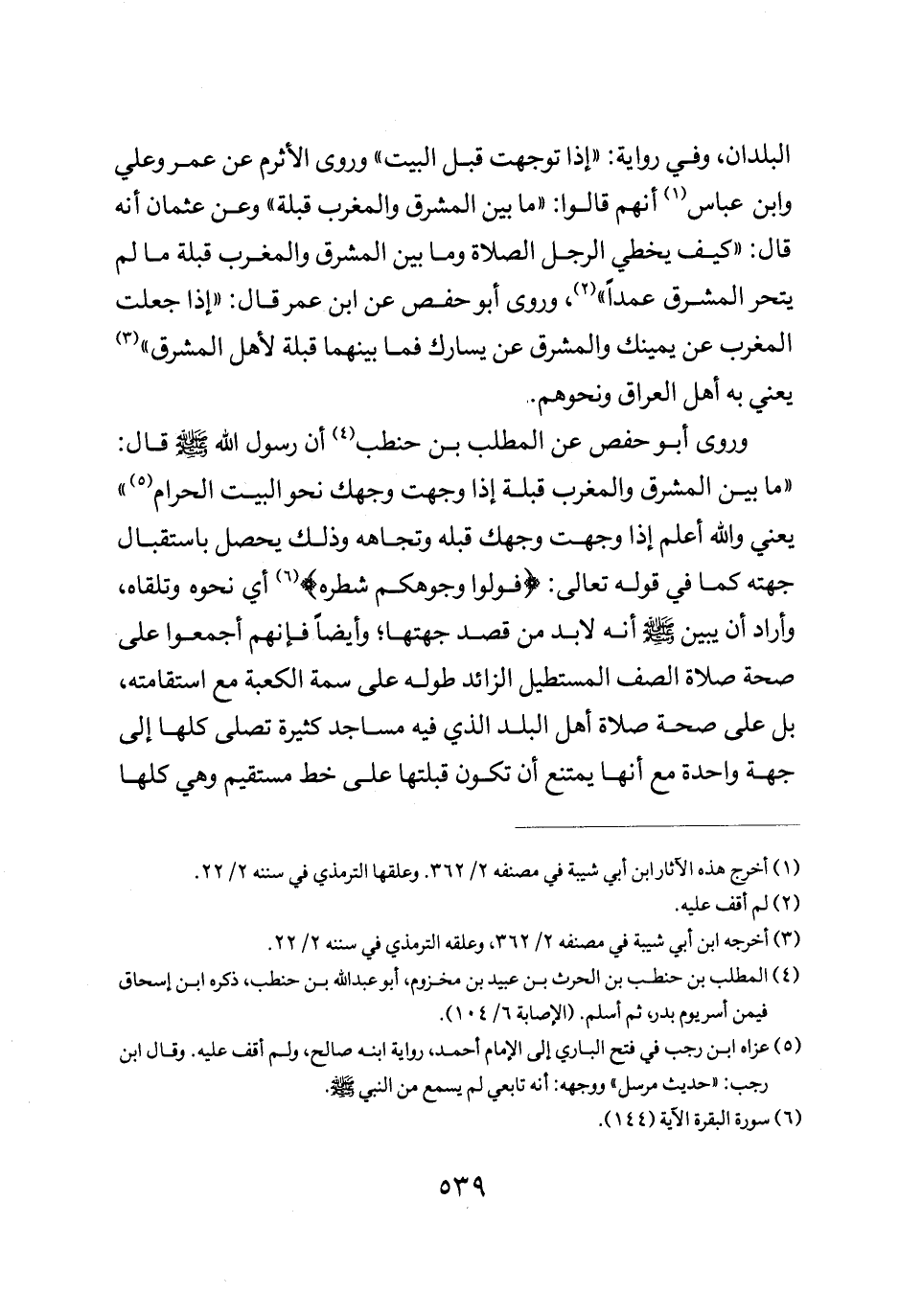 وروى أبو حفص عن المطلب بن حنطب أن رسول الله صلى الله عليه وسلم قال: "ما بين المشرق والمغرب قبلة إذا وجهت وجهك نحو البيت الحرام" يعني والله أعلم إذا وجهت وجهك قبله وتجاهه وذلك يحصل باستقبال جهته كما في قوله تعالى: {فَوَلُّوا وُجُوهَكُمْ شَطْرَهُ} أي نحوه وتلقاءه واراد أن يبين صلى الله عليه وسلم أنه لا بد من قصد جهتها وأيضا فانهم اجمعوا على صحة صلاة الصف المستطيل الزائد طوله على سمة الكعبة مع استقامته بل على صحة صلاة أهل البلد الذي فيه مساجد كثيرة تصلى كلها إلى جهة واحدة مع أنها يمتنع أن تكون قبلتها على خط مستقيم وهي كلها
