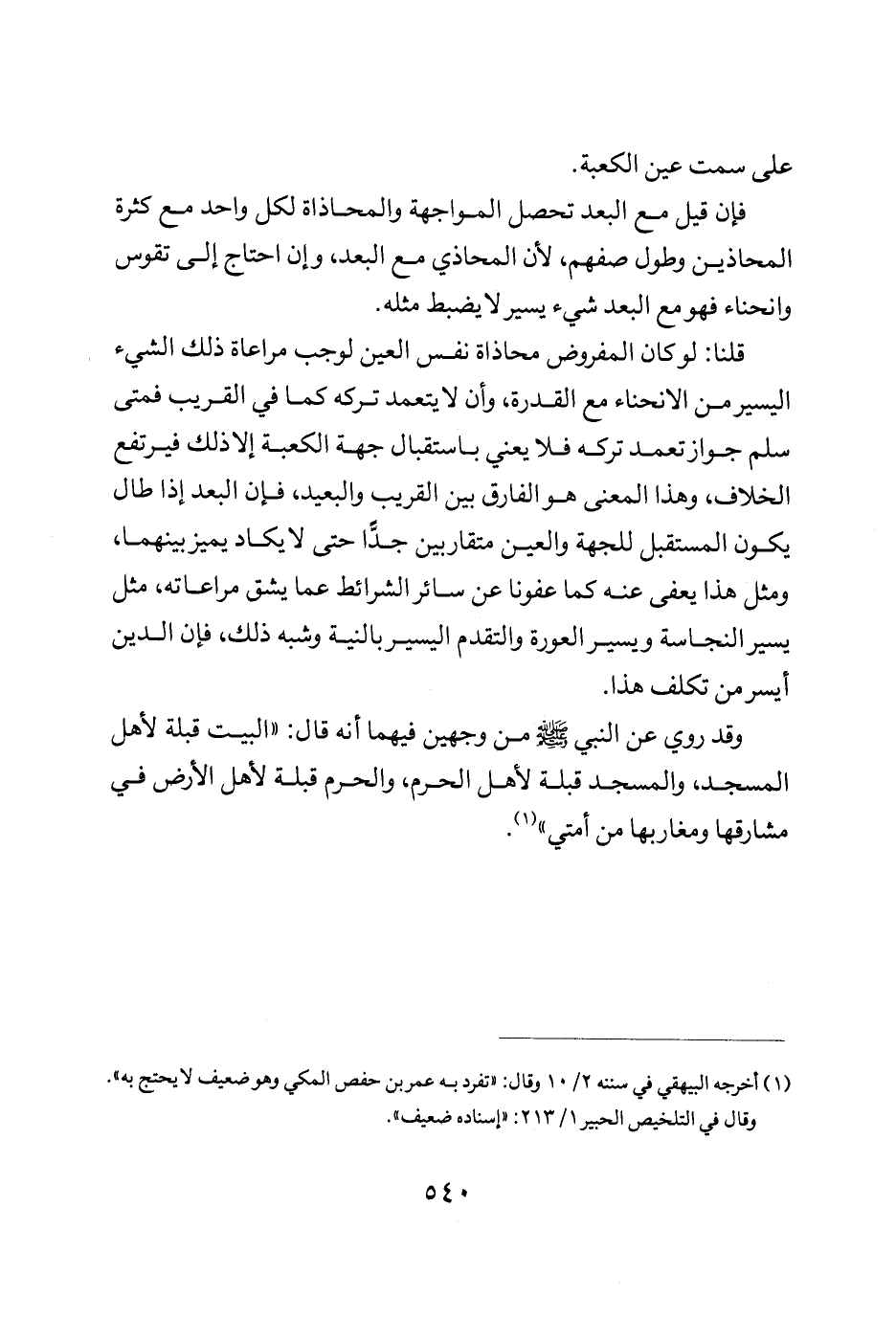 قلنا لو كان المفروض محإذاة نفس العين لوجب مراعاة ذلك الشيء اليسير من الانحناء مع القدرة وأن لا يتعمد تركه كما في القريب فمتى سلم جواز تعمد تركه فلا يعني باستقبال جهة الكعبة إلا ذلك فيرتفع الخلاف وهذا المعنى هو الفارق بين القريب والبعيد فإن البعد إذا طال يكون المستقبل للجهة والعين متقاربين جدا حتى لا يكاد يميز بينهما ومثل هذا يعفى عنه كما عفونا عن سائر الشرائط عما يشق مراعاته مثل يسير النجاسة ويسير العورة والتقدم اليسير بالنية وشبه ذلك فإن الدين ايسر من تكلف هذا.