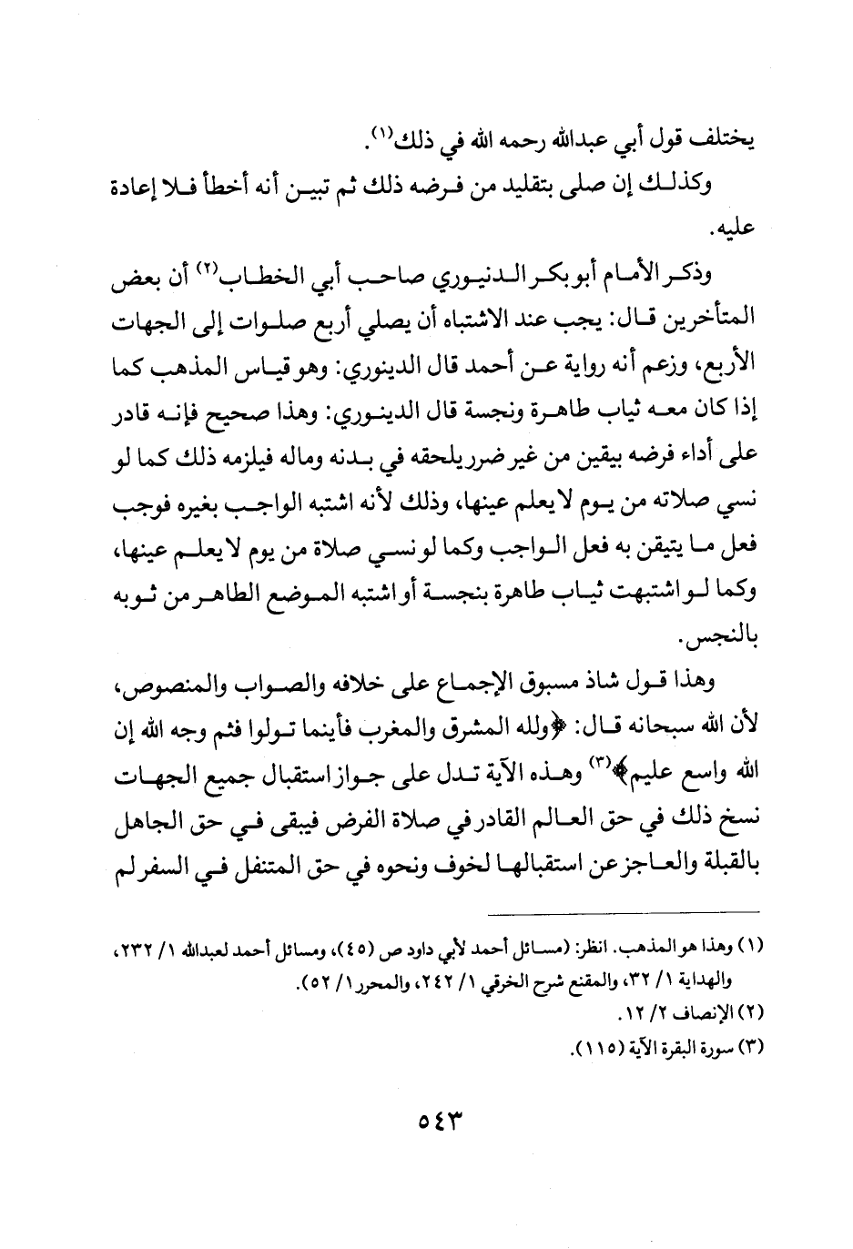 وهذا قول شاذ مسبوق الإجماع على خلافه والصواب والمنصوص لأن الله سبحانه قال: {وَلِلَّهِ الْمَشْرِقُ وَالْمَغْرِبُ فَأَيْنَمَا تُوَلُّوا فَثَمَّ وَجْهُ اللَّهِ أن اللَّهَ وَاسِعٌ عَلِيمٌ} وهذه الآية تدل على جواز استقبال جميع الجهات نسخ ذلك في حق العالم القادر في صلاة الفرد فيبقى في حق الجاهل بالقبلة والعاجز عن استقبالها لخوف ونحوه في حق المتنفل في السفر لم