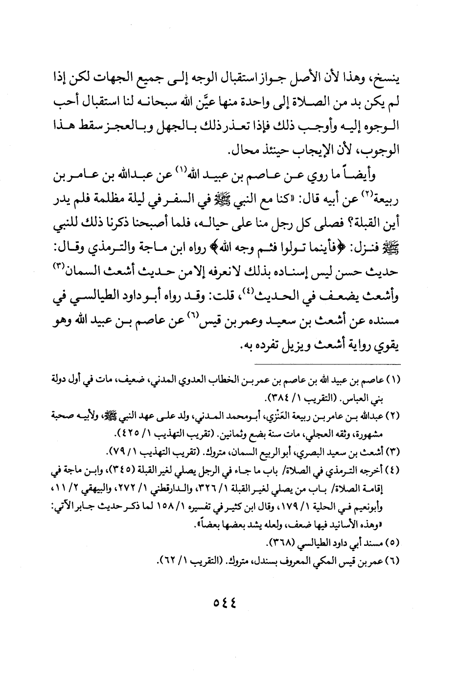 وأيضا ما روى عن عاصم بن عبيد الله عن عبد الله بن عامر بن ربيعة عن ابيه قال كنا مع النبي صلى الله عليه وسلم في السفر في ليلة مظلمة فلم يدر اين القبلة فصلى كل رجل منا على حياله فلما اصبحنا ذكرنا ذلك للنبي صلى الله عليه وسلم فنزل {فَأَيْنَمَا تُوَلُّوا فَثَمَّ وَجْهُ اللَّهِ} " رواه ابن ماجة والترمذي وقال حديث حسن ليس اسناده بذلك لا نعرفه إلا من حديث اشعث السمان واشعث يضعف في الحديث قلت وقد رواه أبو داود الطيالسي في مسنده عن اشعث بن سعيد وعمر بن قيس عن عاصم بن عبيد الله وهو يقوي رواية اشعث ويزيل تفرده به.