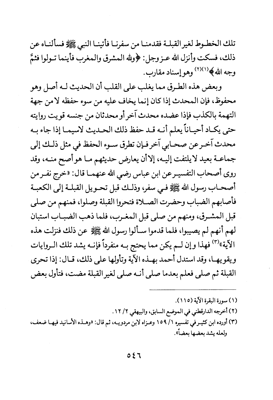 وبعض هذه الطرق مما يغلب على القلب أن الحديث له أصل وهو محفوظ فإن المحدث إذا كان إنما يخاف عليه من سوء حفظه لا من جهة التهمة بالكذب فإذا عضده محدث اخر أو محدثان من جنسه قويت روايته حتى يكاد احيانا يعلم أنه قد حفظ ذلك الحديث لا سيما إذا جاء به محدث اخر عن صحابي اخر فإن تطرق سوء الحفظ في مثل ذلك إلى جماعة بعيد لا يلتفت إليه إلا أن يعارض حديثهم ما هو أصح منه وقد روى أصحاب التفسير عن ابن عباس رضي الله عنهما قال خرج نفر من أصحاب رسول الله صلى الله عليه وسلم في سفر وذلك قبل تحويل القبلة إلى الكعبة فأصابهم الضباب وحضرت الصلاة فتحروا القبلة وصلوا فمنهم من صلى قبل المشرق ومنهم من صلى قبل المغرب فلما ذهب الضباب استبان لهم أنهم لم يصيبوا فلما قدموا سالوا رسول الله صلى الله عليه وسلم عن ذلك فنزلت هذه الآية فهذا وأن لم يكن مما يحتج به منفردا فإنه يشد تلك الروايات ويقويها وقد استدل أحمد بهذه الآية وتاولها على ذلك قال إذا تحرى القبلة ثم صلى فعلم بعدما صلى أنه صلى لغير القبلة مضت فتأول بعض
