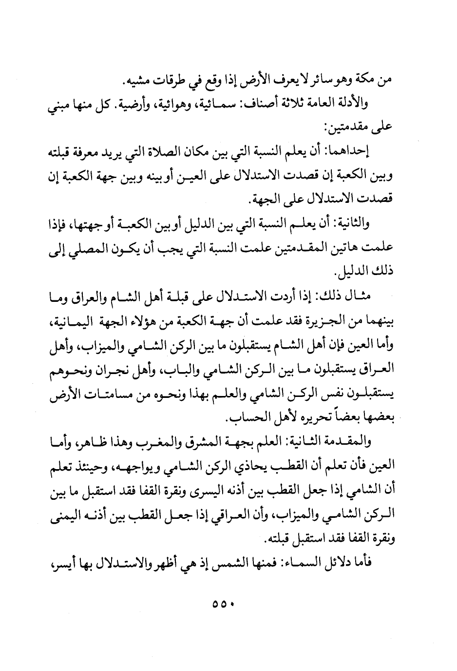 والثانية: أن يعلم النسبة التي بين الدليل أو بين الكعبة أو جهتها فإذا علمت هاتين المقدمتين علمت النسبة التي يجب أن يكون المصلي إلى ذلك الدليل.
