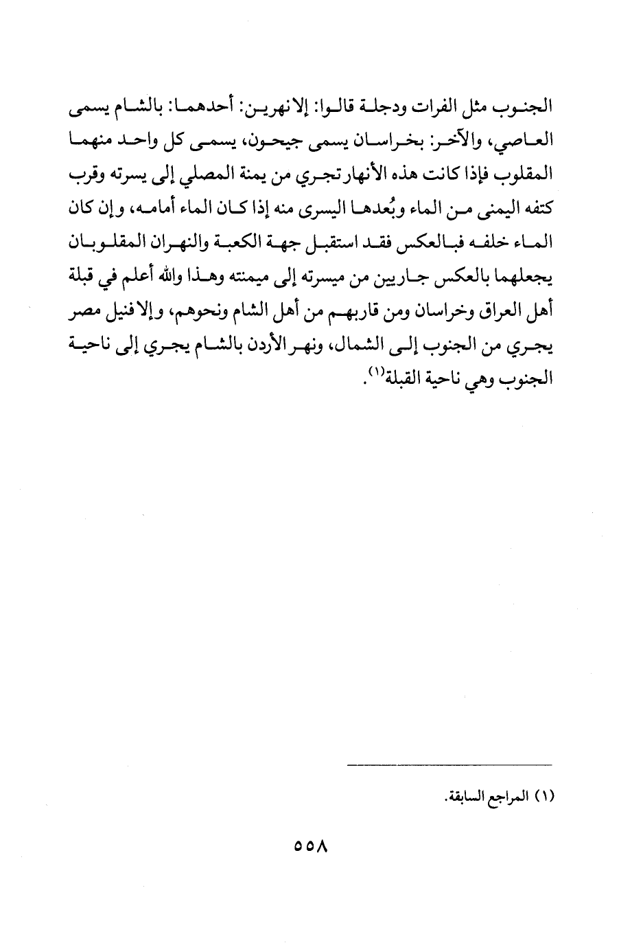 الجنوب مثل الفرات ودجلة قالوا إلا نهرين أحدهما: بالشام يسمى العاصي والاخر بخراسان يسمى جيحون يسمى كل واحد منهما المقلوب فإذا كانت هذه الأنهار تجري من يمنة المصلي إلى يسرته وقرب كتفه الايمن من الماء وبعدها اليسرى منه إذا كان الماء امامه وأن كان الماء خلفه فبالعكس فقد استقبل جهة الكعبة والنهران المقلوبات يجعلهما بالعكس جاريين من ميسرته إلى ميمنته وهذا والله أعلم في قبلة أهل العراق وخراسان ومن قاربهم من أهل الشام ونحوهم والا فنيل مصر يجري من الجنوب إلى الشمال ونهر الاردن بالشام يجري إلى ناحية الجنوب وهي ناحية القبلة.