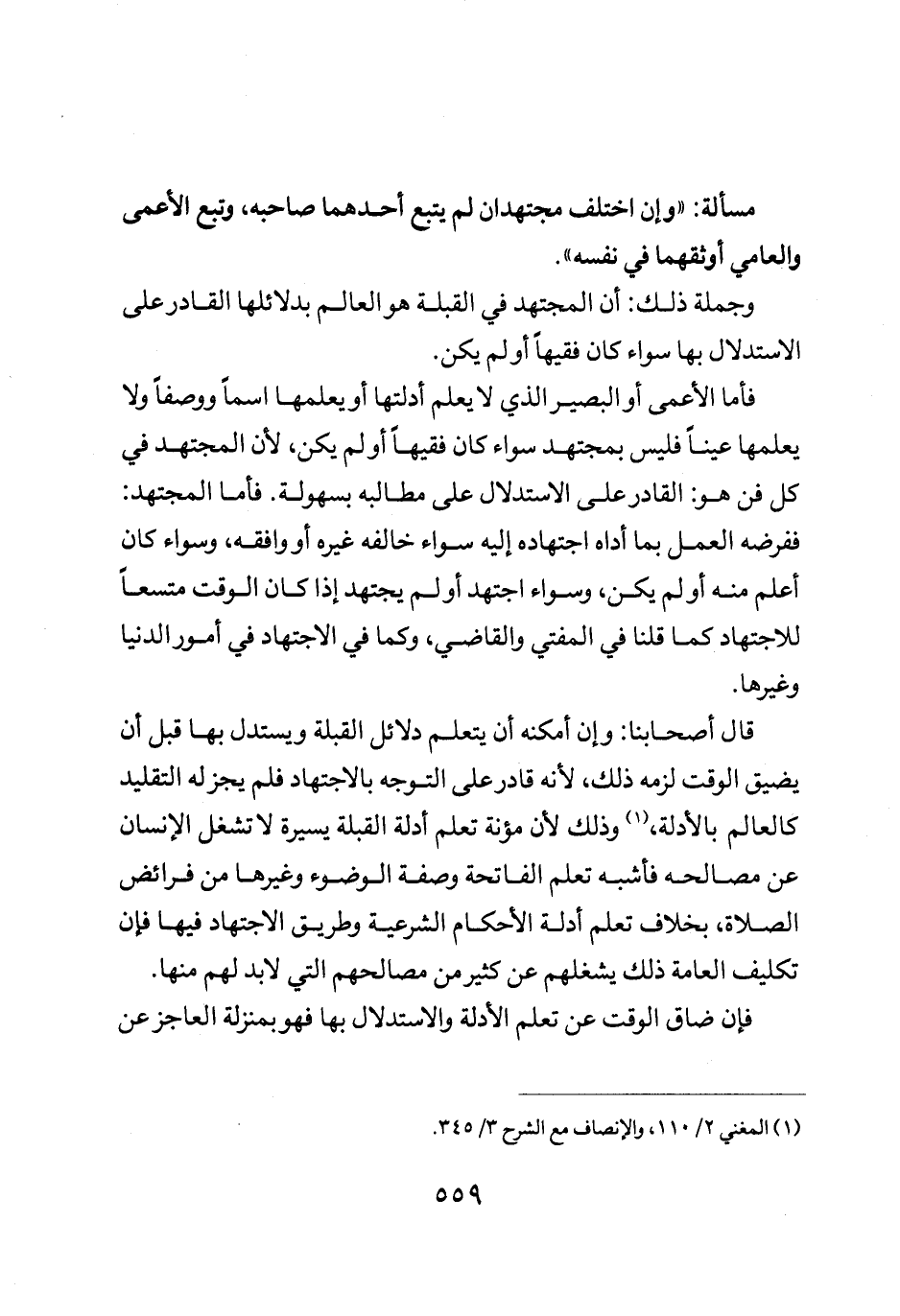 فأما الأعمى أو البصير الذي لا يعلم ادلتها أو يعلمها اسما ووصفا ولا يعلمها عينا فليس بمجتهد سواء كان فقيها أو لم يكن لأن المجتهد في كل فن هو القادر على الاستدلال على مطالبه بسهولة فأما المجتهد ففرضه العمل بما اداه اجتهاده إليه سواء خالفه غيره أو وافقه وسواء كان أعلم منه أو لم يكن وسواء اجتهد أو لم يجتهد إذا كان الوقت متسعا للاجتهاد كما قلنا في المفتي والقاضي وكما في الاجتهاد في امور الدنيا وغيرها.