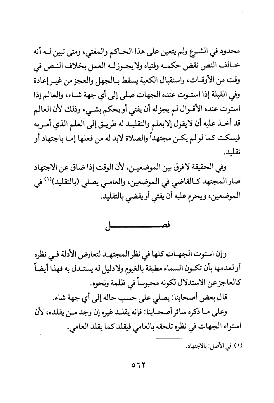 محدود في الشرع ولم يتعين على هذا الحاكم والمفتي ومتى تبين له أنه خالف النص نقض حكمه وفتياه ولا يجوز له العمل بخلاف النص في وقت من الاوقات واستقبال الكعبة يسقط بالجهل والعجز من غير إعادة وفي القبلة إذا استوت عنده الجهات صلى إلى أي جهة شاء والعالم إذا استوت عنده الاقوال لم يجز له أن يفتي أو يحكم بشيء وذلك لأن العالم قد أخذ عليه أن لا يقول إلا بعلم والتقليد له طريق إلى العلم الذي أمر به فيسكت كما لو لم يكن مجتهدا والصلاة لا بد له من فعلها أما باجتهاد أو تقليد.
