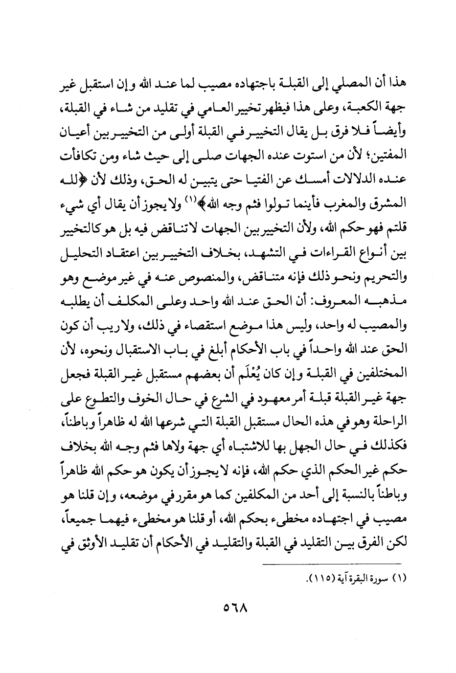 هذا أن المصلي إلى القبلة باجتهاده مصيب لما عند الله وأن استقبل غير جهة الكعبة وعلى هذا فيظهر تخيير العامي في تقليد من شاء في القبلة وأيضا فلا فرق بل يقال التخيير في القبلة أولى من التخيير بين اعيان المفتين لأن من استوت عنده الجهات صلى إلى حيث شاء ومن تكافات عنده الدلالات امسك عن الفتيا حتى يتبين له الحق وذلك لأن {وَلِلَّهِ الْمَشْرِقُ وَالْمَغْرِبُ فَأَيْنَمَا تُوَلُّوا فَثَمَّ وَجْهُ اللَّهِ} ولا يجوز أن يقال أي شيء قلتم فهو حكم الله ولأن التخيير بين الجهات لا تناقض فيه بل هو كالتخيير بين انواع القراءات في التشهد بخلاف التخيير بين اعتقاد التحليل والتحريم ونحو ذلك فإنه متناقض والمنصوص عنه في غير موضع وهو مذهب معروف أن الحق عند الله واحد وعلى المكلف أن يطلبه والمصيب له واحد وليس هذا موضع استقصاء في ذلك ولا ريب أن كون الحق عند الله واحدا في باب الأحكام ابلغ في باب الاستقبال ونحوه لأن المختلفين في القبلة وأن كان يعلم أن بعضهم مستقبل غير القبلة فجعل جهة غير القبلة قبلة أمر معهود في الشرع في حال الخوف والتطوع على الراحلة وهو في هذه الحال مستقبل القبلة التي شرعها الله له ظاهرا وباطنا فكذلك في حال الجهل بها للاشتباه أي جهة ولاها فثم وجه الله بخلاف حكم غير الحكم الذي حكم الله فإنه لا يجوز أن يكون هو حكم الله ظاهرا وباطنا بالنسبة إلى أحد من المكلفين كما هو مقرر في موضعه وأن قلنا هو مصيب في اجتهاده مخطىء بحكم الله أو قلنا هو مخطئ فيهما جميعا لكن الفرق بين التقليد في القبلة والتقليد في الأحكام أن تقليد الاوثق فيه