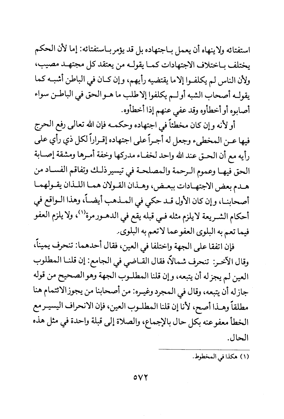 أو لأنه وأن كان مخطئا في اجتهاده وحكمه فإن الله تعالى رفع الحرج فيها عن المخطىء وجعل له اجرا على اجتهاده اقرارا لكل ذي راي على رأيه مع أن الحق عند الله واحد بخفاء مدركها وخفة امرها ومشقة اصابة الحق فيها وعموم الرحمة والمصلحة في تيسير ذلك وتفاقم الفساد من هدم بعض الاجتهادات ببعض وهذان القولان هما اللذان يقولهما أصحابنا وأن كان الأول قد حكي في المذهب أيضا وهذا الواقع في احكام الشريعة لا يلزم مثله في قبله يقع في الدهور مرة ولا يلزم العفو فيما تعم به البلوى العفو عما لا تعم به البلوى.