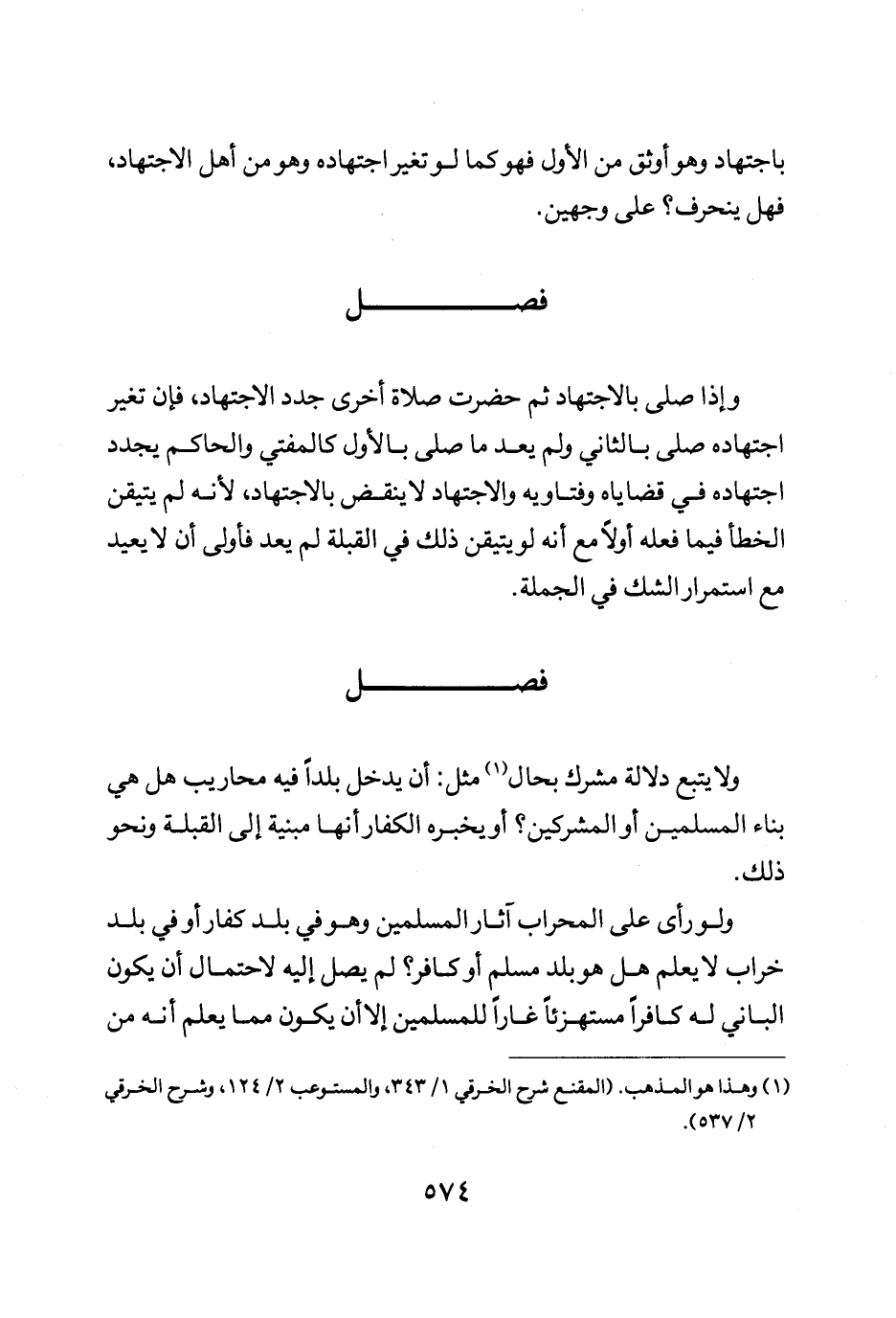 وإذا صلى بالاجتهاد ثم حضر صلاة اخرى جدد الاجتهاد فإن تغير اجتهاده صلى بالثاني ولم يعد ما صلى بالأول كالمفتي والحاكم يجدد اجتهاده في قضاياه وفتاويه والاجتهاد لا ينقض بالاجتهاد لأنه لم يتيقن الخطا فيما فعله اولا مع أنه لو يتيقن ذلك في القبلة لم يعد فاولى أن لا يعيد مع استمرار الشك في الجملة.