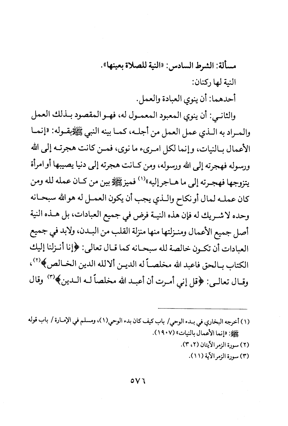والثاني: أن ينوي المعبود المعمول له فهو المقصود بذلك العمل والمراد به الذي عمل العمل من اجله كما بينه النبي صلى الله عليه وسلم بقوله: "إنما الاعمال بالنيات وإنما لكل امرء ما نوى فمن كانت هجرته إلى الله ورسوله فهجرته إلى الله ورسوله ومن كانت هجرته إلى دنيا يصيبها أو امرأة يتزوجها فهجرته إلى ما هاجر إليه" فميز صلى الله عليه وسلم بين من كان عمله لله ومن كان عمله لمال أو نكاح والذي يجب أن يكون العمل له هو الله سبحانه وحده لا شريك له فإن هذه النية فرض في جميع العبادات بل هذه النية أصل جميع الاعمال ومنزلتها منها منزلة القلب من البدن ولا بد في جميع العبادات أن تكون خالصة لله سبحانه كما قال تعالى: {إِنَّا أَنْزَلْنَا إِلَيْكَ الْكِتَابَ بِالْحَقِّ فَاعْبُدِ اللَّهَ مُخْلِصاً لَهُ الدِّينَ إلا لِلَّهِ الدِّينُ الْخَالِصُ}.