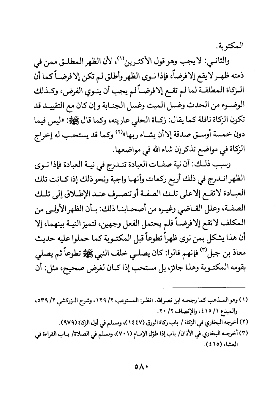 والثاني: لا يجب وهو قول الأكثرين لأن الظهر المطلق ممن في ذمته ظهر لا يقع إلا فرضا فإذا نوى الظهر واطلق لم تكن إلا فرضا كما أن الزكاة المطلقة لما لم تقع إلا فرضا لم يجب أن ينوي الفرض وكذلك الوضوء من الحدث وغسل الميت وغسل الجنابة وأن كان مع التقييد قد تكون الزكاة نافلة كما يقال زكاة الحلي عاريته وكما قال صلى الله عليه وسلم: "ليس فيما دون خمسة اوسق صدقة إلا أن يشاء ربها" وكما قد يستحب له إخراج الزكاة في مواضع تذكر أن شاء الله تعالى في مواضعها.