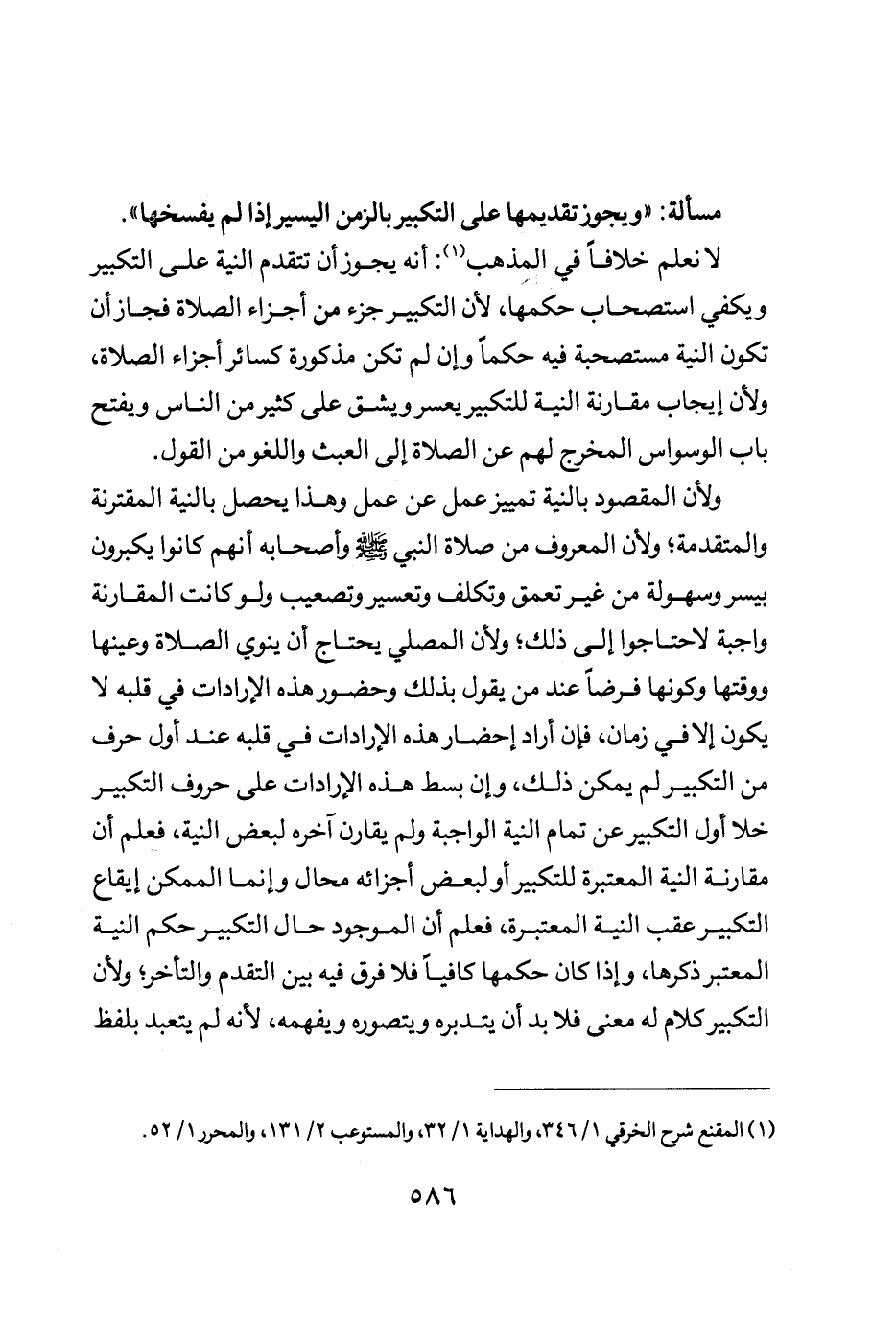 ولأن المقصود بالنية تمييز عمل عن عمل وهذا يحصل بالنية المقترنة والمتقدمة ولأن المعروف من صلاة النبي صلى الله عليه وسلم وأصحابه أنهم كانوا يكبرون بيسر وسهولة من غير تعمق وتكلف وتعسير وتصعيب ولو كانت المقرانة واجبة لاحتاجوا إلى ذلك ولأن المصلي يحتاج أن ينوي الصلاة وعينها ووقتها وكونها فرضا عند من يقول بذلك وحضور هذه الارادات فيي قلبه لا يكون إلا في زمن فإن أراد احضار هذه الارادات في قلبه عند أول حرف من التكبير لم يمكن ذلك وأن بسط هذه الارادات على حروف التكبير خلى أول التكبير عن تمام النية الواجبة ولم يقارن اخره لبعض النية فعلم أن مقارنة النية المعتبرة للتكبير أو لبعض اجزائه محال وإنما الممكن ايقاع التكبير عقب النية المعتبرة فعلم أن الموجود حال التكبير حكم النية المعتبر ذكرها وإذا كان حكمها كافيا فلا فرق فيه بين التقدم والتأخر ولأن التكبير كلام له معنى فلا بد أن يتدبره ويتصوره ويفهمه لأنه لم يتعبد بلفظ