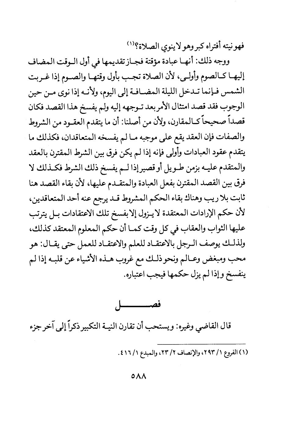 ووجه ذلك أنها عبادة مؤقتة فجاز تقديمها في أول الوقت المضاف إليها كالصوم واولى لأن الصلاة تجب باول وقتها والصوم إذا غربت الشمس فإنما تدخل الليلة المضافة إلى اليوم ولأنه إذا نوى من حين الوجوب فقد قصد امتثال الأمر بعد توجهه إليه ولم يفسخ هذا القصد فكان قصدا صحيحا كالمقارن ولأن من اصلنا أن ما يتقدم العقود من الشروط والصفات فإن العقد يقع على موجبه ما لم يفسخه المتعاقد أن فكذلك ما يتقدم عقود العبادات واولى فإنه إذا لم يكن فرق بين الشرط المقترن بالعقد والمتقدم عليه بزمن طويل أو قصير إذا لم يفسخ ذلك الشرط فكذلك لا فرق بين القصد المقترن بفعل العبادة والمتقدم عليها لأن بقاء القصد هنا ثابت بلاريب وهناك بقاء الحكم المشروط قد يرجع عنه أحد المتعاقدين لأن حكم الارادات المعتقدة لا يزول إلا بفسخ تلك الاعقادات بل يترتب عليها الثواب والعقاب في كل وقت كما أن حكم المعلوم المعتقد كذلك ولذلك يوصف الرجل بالاعتقاد للعلم والاعتقاد للعمل حتى يقال هو محب ومبغض وعالم ونحو ذلك مع غروب هذه الأشياء عن قلبه إذا لم ينفسخ وإذا لم يزل حكمها فيجب اعتباره.
