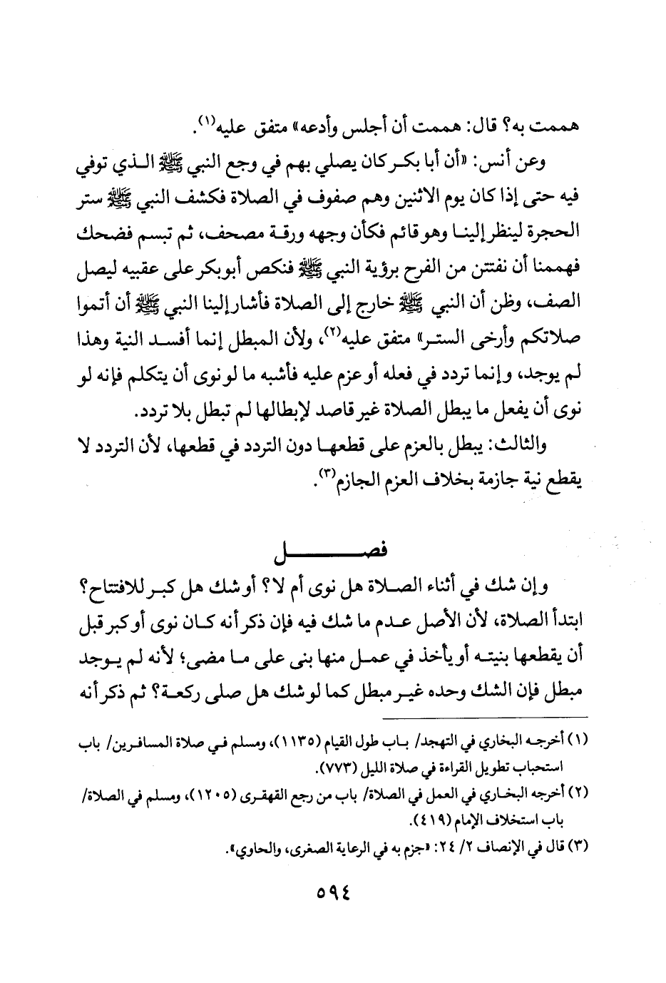 وعن أنس: "أن ابا بكر كان يصلي بهم في وجع النبي صلى الله عليه وسلم الذي توفي فيه حتى إذا كان يوم الاثنين وهم صفوف في الصلاة فكشف النبي صلى الله عليه وسلم ستر الحجرة لينظر الينا وهو قائم فكأن وجهه ورقة مصحف ثم تبسم فضحك فههمنا أن نفتتن من الفرح برؤية النبي صلى الله عليه وسلم فنكص أبو بكر على عقبيه ليصل الصف وظن أن النبي صلى الله عليه وسلم خارج إلى الصلاة فاشار الينا النبي صلى الله عليه وسلم أن اتموا صلاتكم وارخى الستر" متفق عليه ولأن المبطل إنما افسد النية وهذا لم يوجد وإنما تردد في فعله أو عزم عليه فاشبه ما لو نوى أن يتكلم فإنه لو نوى أن يفعل ما يبطل الصلاة غير قاصد لابطالها لم تبطل بلا تردد.