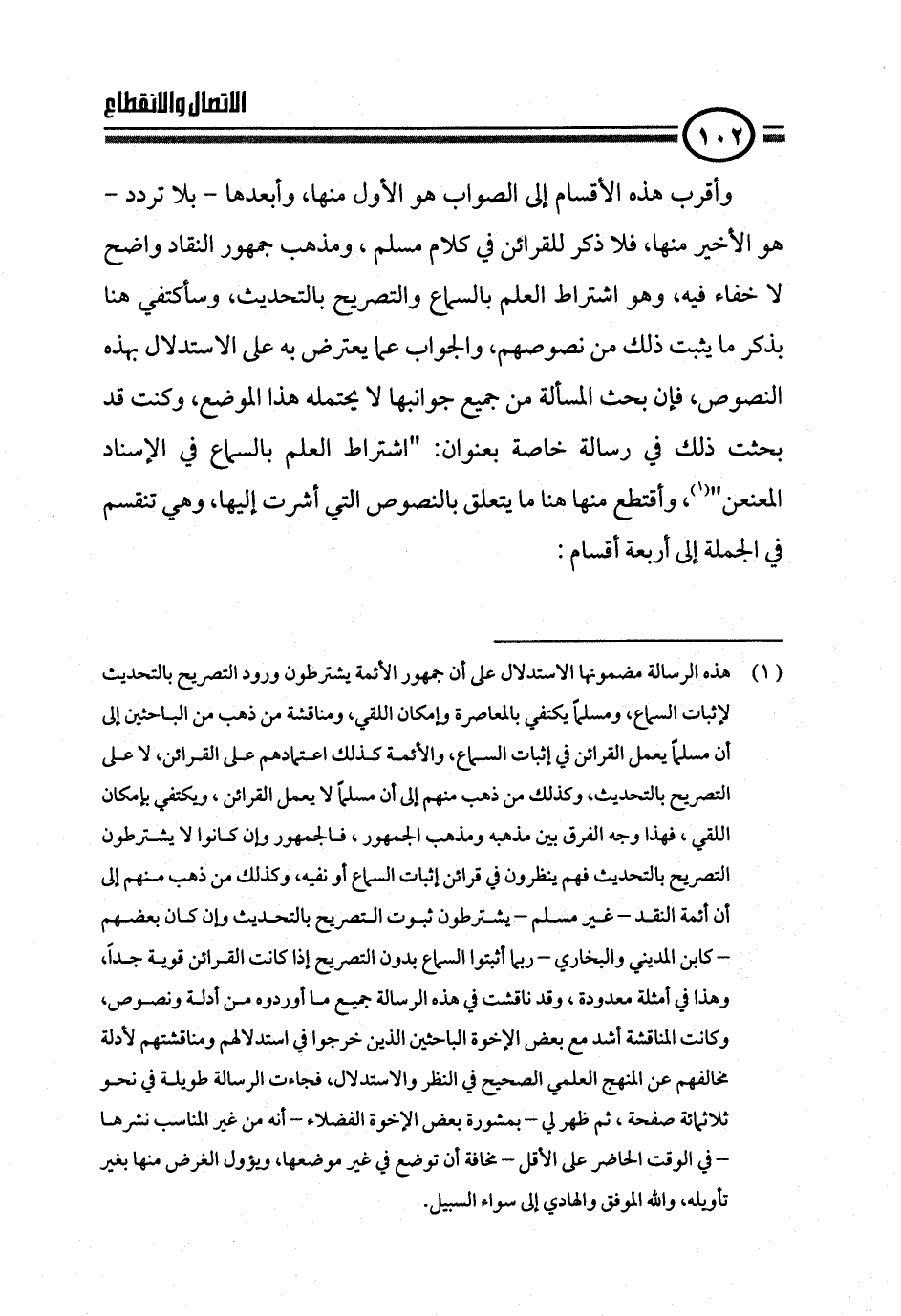 وأقرب هذه الأقسام إلى الصواب هو الأول منها، وأبعدها - بلا تردد - هو الأخير منها، فلا ذكر للقرائن في كلام مسلم، ومذهب جمهور النقاد واضح لا خفاء فيه، وهو اشتراط العلم بالسماع والتصريح بالتحديث، وسأكتفي هنا بذكر ما يثبت ذلك من نصوصهم، والجواب عما يعترض به على الاستدلال بهذه النصوص، فإن بحث المسألة من جميع جوانبها لا يحتمله هذا الموضع، وكنت قد بحثت ذلك في رسالة خاصة بعنوان: "اشتراط العلم بالسماع في الإسناد المعنعن" (¬١)،