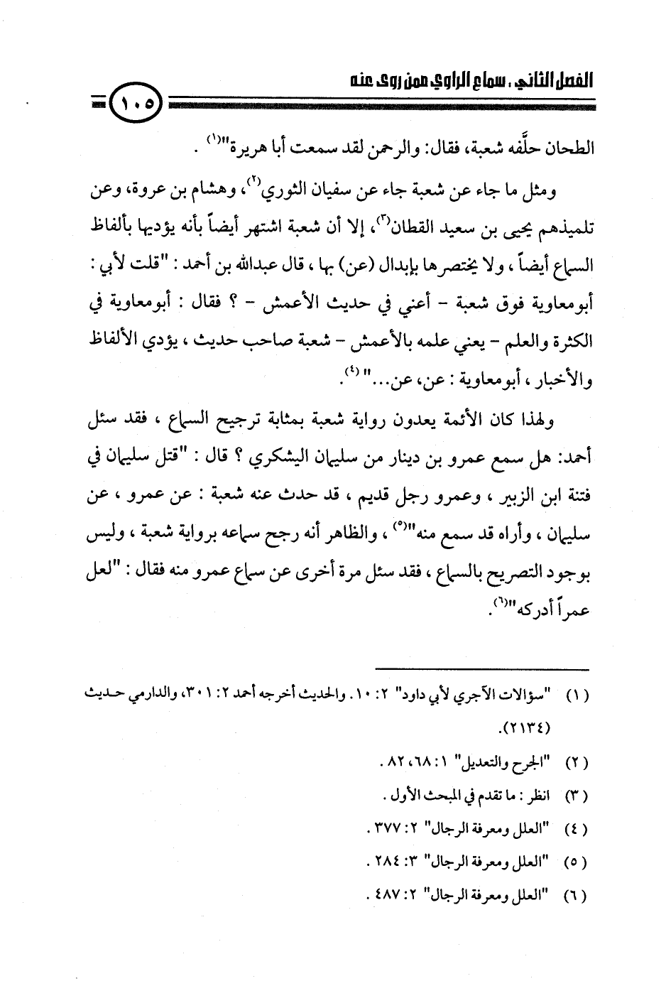 ولهذا كان الأئمة يعدون رواية شعبة بمثابة ترجيح السماع، فقد سئل أحمد: هل سمع عمرو بن دينار من سليمان اليشكري؟ قال: "قتل سليمان في فتنة ابن الزبير، وعمرو رجل قديم، قد حدث عنه شعبة: عن عمرو، عن سليمان، وأراه قد سمع منه" (¬٥)، والظاهر أنه رجح سماعه برواية شعبة، وليس بوجود التصريح بالسماع، فقد سئل مرة أخرى عن سماع عمرو منه فقال: "لعل عمراً أدركه" (¬٦).