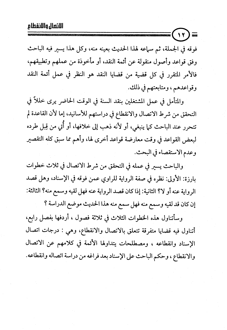 وسأتناول هذه الخطوات الثلاث في ثلاثة فصول، أردفها بفصل رابع، أتناول فيه قضايا متفرقة تتعلق بالاتصال والانقطاع، وهي: درجات اتصال الإسناد وانقطاعه، ومصطلحات يتداولها الأئمة في كلامهم عن الاتصال والانقطاع، وحكم الباحث على الإسناد بعد فراغه من دراسة اتصاله وانقطاعه.