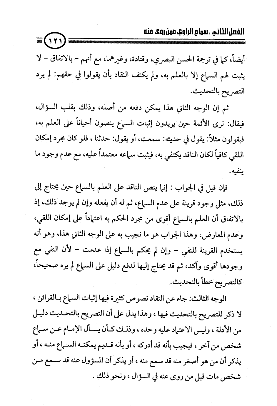 فإن قيل في الجواب: إنما ينص الناقد على العلم بالسماع حين يحتاج إلى ذلك، مثل وجود قرينة على عدم السماع، ثم له أن يفعله وإن لم يوجد ذلك، إذ بالاتفاق أن العلم بالسماع أقوى من مجرد الحكم به اعتماداً على إمكان اللقي، وعدم المعارض، وهذا الجواب هو ما نجيب به على الوجه الثاني هذا، وهو أنه يستخدم القرينة للنفي - وإن لم يحكم بالسماع إذا عدمت - لأن النفي مع وجودها أقوى وآكد، ثم قد يحتاج إليها لدفع دليل على السماع لم يره صحيحاً، كالتصريح خطأ بالتحديث.