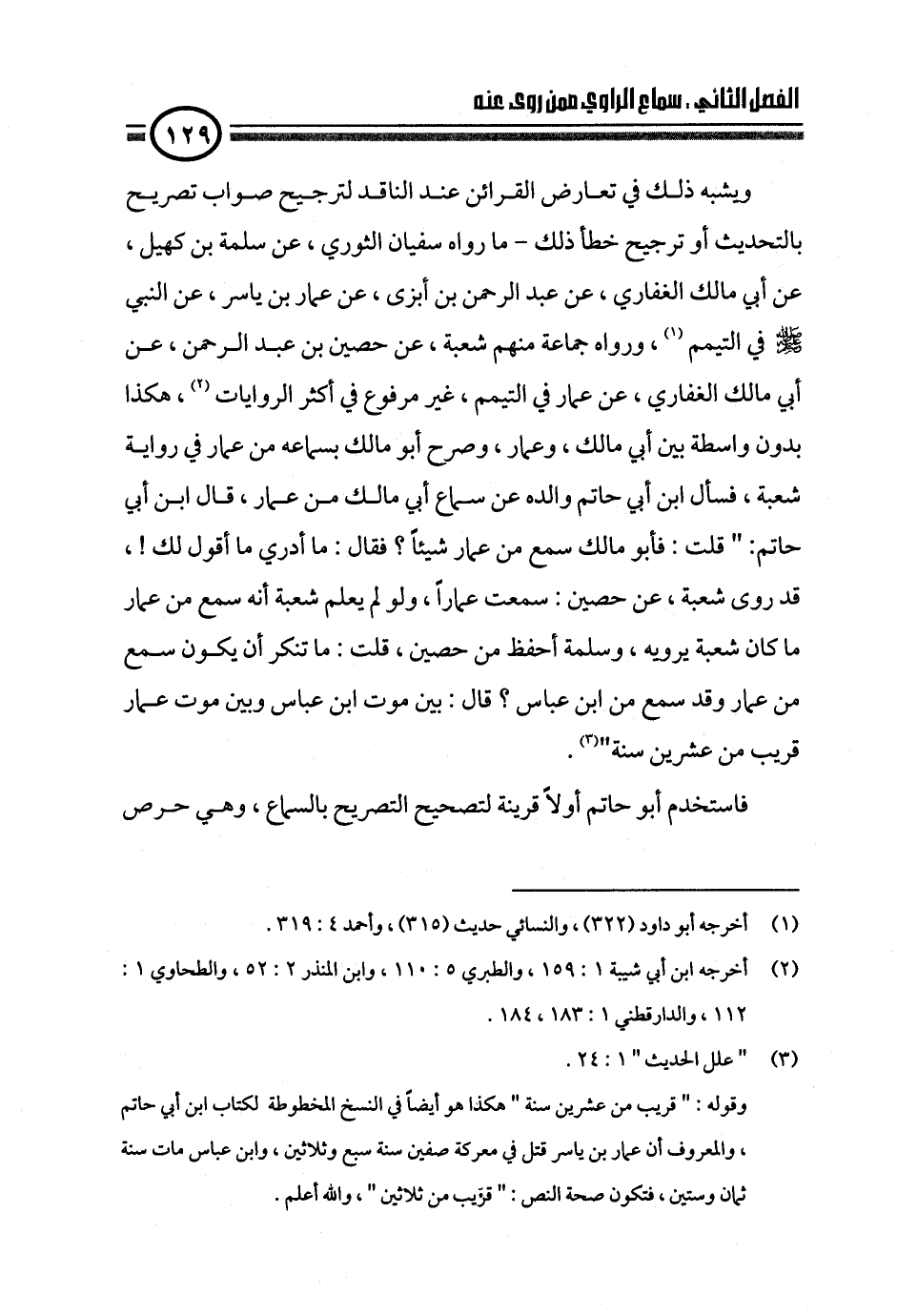 ويشبه ذلك في تعارض القرائن عند الناقد لترجيح صواب تصريح بالتحديث أو ترجيح خطأ ذلك - ما رواه سفيان الثوري، عن سلمة بن كهيل، عن أبي مالك الغفاري، عن عبد الرحمن بن أبزى، عن عمار بن ياسر، عن النبي - صلى الله عليه وسلم - في التيمم (¬١)، ورواه جماعة منهم شعبة، عن حصين بن عبد الرحمن، عن أبي مالك الغفاري، عن عمار في التيمم، غير مرفوع في أكثر الروايات (¬٢)، هكذا بدون واسطة بين أبي مالك، وعمار، وصرح أبو مالك بسماعه من عمار في رواية شعبة، فسأل ابن أبي حاتم والده عن سماع أبي مالك من عمار، قال ابن أبي حاتم: " قلت: فأبو مالك سمع من عمار شيئاً؟ فقال: ما أدري ما أقول لك! ، قد روى شعبة، عن حصين: سمعت عماراً، ولو لم يعلم شعبة أنه سمع من عمار ما كان شعبة يرويه، وسلمة أحفظ من حصين، قلت: ما تنكر أن يكون سمع من عمار وقد سمع من ابن عباس؟ قال: بين موت ابن عباس وبين موت عمار قريب من عشرين سنة" (¬٣).