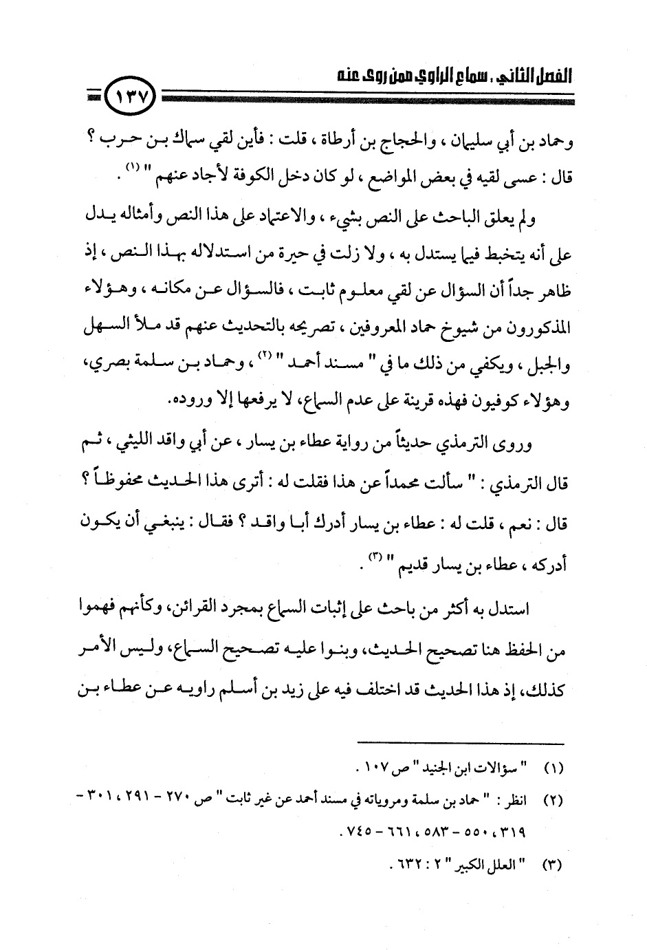 ولم يعلق الباحث على النص بشيء، والاعتماد على هذا النص وأمثاله يدل على أنه يتخبط فيما يستدل به، ولا زلت في حيرة من استدلاله بهذا النص، إذ ظاهر جداً أن السؤال عن لقي معلوم ثابت، فالسؤال عن مكانه، وهؤلاء المذكورون من شيوخ حماد المعروفين، تصريحه بالتحديث عنهم قد ملأ السهل والجبل، ويكفي من ذلك ما في " مسند أحمد " (¬٢)، وحماد بن سلمة بصري، وهؤلاء كوفيون فهذه قرينة على عدم السماع، لا يرفعها إلا وروده.