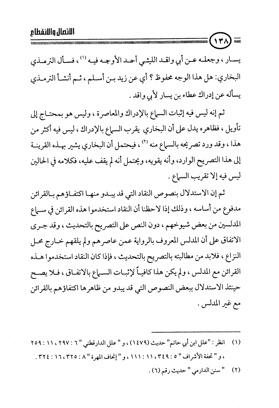 ثم إن الاستدلال بنصوص النقاد التي قد يبدو منها اكتفاؤهم بالقرائن مدفوع من أساسه، وذلك إذا لاحظنا أن النقاد استخدموا هذه القرائن في سماع المدلسين من بعض شيوخهم، دون النص على التصريح بالتحديث، وقد جرى الاتفاق على أن المدلس المعروف بالرواية عمن عاصرهم ولم يلقهم خارج محل النزاع، فلابد من مطالبته بالتصريح بالتحديث، فإذا كان النقاد استخدموا هذه القرائن مع المدلس، ولم يكن هذا كافياً لإثبات السماع بالاتفاق، فلا يصح حينئذ الاستدلال ببعض النصوص التي قد يبدو من ظاهرها اكتفاؤهم بالقرائن مع غير المدلس.