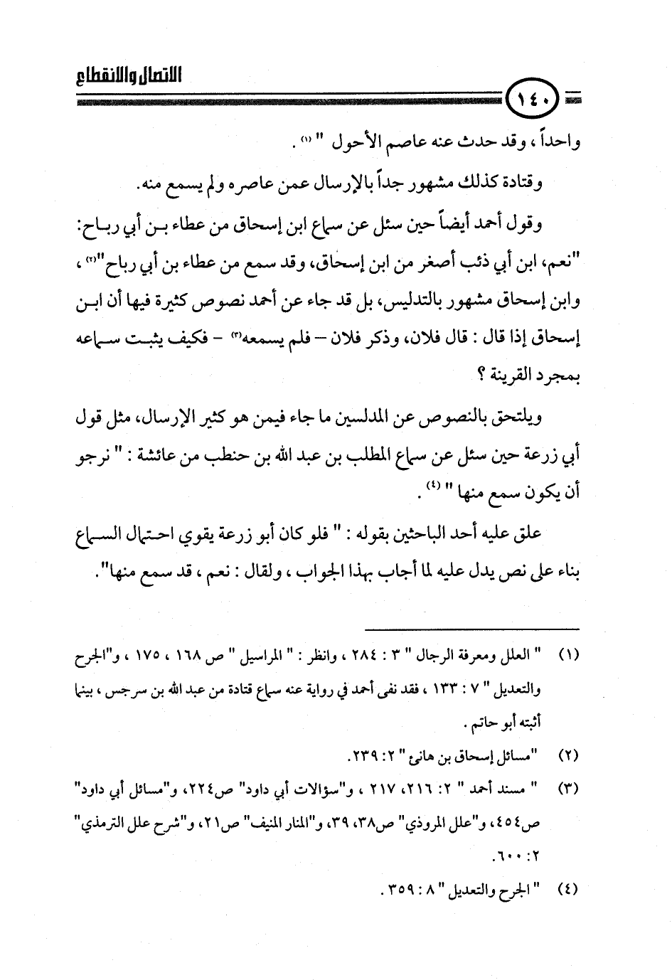 (¬١). " العلل ومعرفة الرجال " ٣: ٢٨٤، وانظر: " المراسيل " ص ١٦٨، ١٧٥، و"الجرح والتعديل " ٧: ١٣٣، فقد نفى أحمد في رواية عنه سماع قتادة من عبد الله بن سرجس، بينما أثبته أبو حاتم.