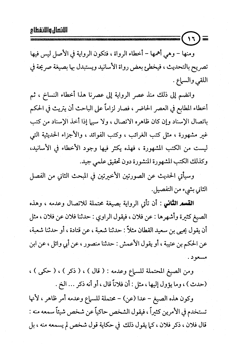 القسم الثاني: أن تأتي الرواية بصيغة محتملة للاتصال وعدمه، وهذه الصيغ كثيرة وأشهرها: عن فلان، فيقول الراوي: حدثنا فلان عن فلان، مثل أن يقول يحيى بن سعيد القطان مثلاً: حدثنا شعبة، عن قتادة، أو حدثنا شعبة، عن الحكم بن عتيبة، أو يقول الأعمش: حدثنا منصور، عن أبي وائل، عن ابن مسعود.