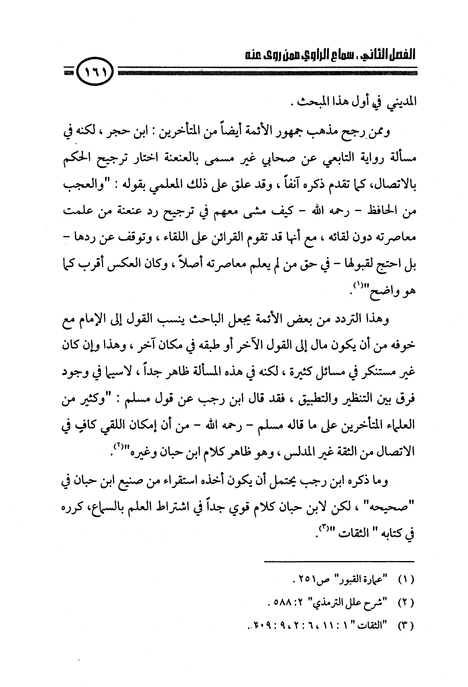 وما ذكره ابن رجب يحتمل أن يكون أخذه استقراء من صنيع ابن حبان في "صحيحه"، لكن لابن حبان كلام قوي جداً في اشتراط العلم بالسماع، كرره في كتابه " الثقات " (¬٣).