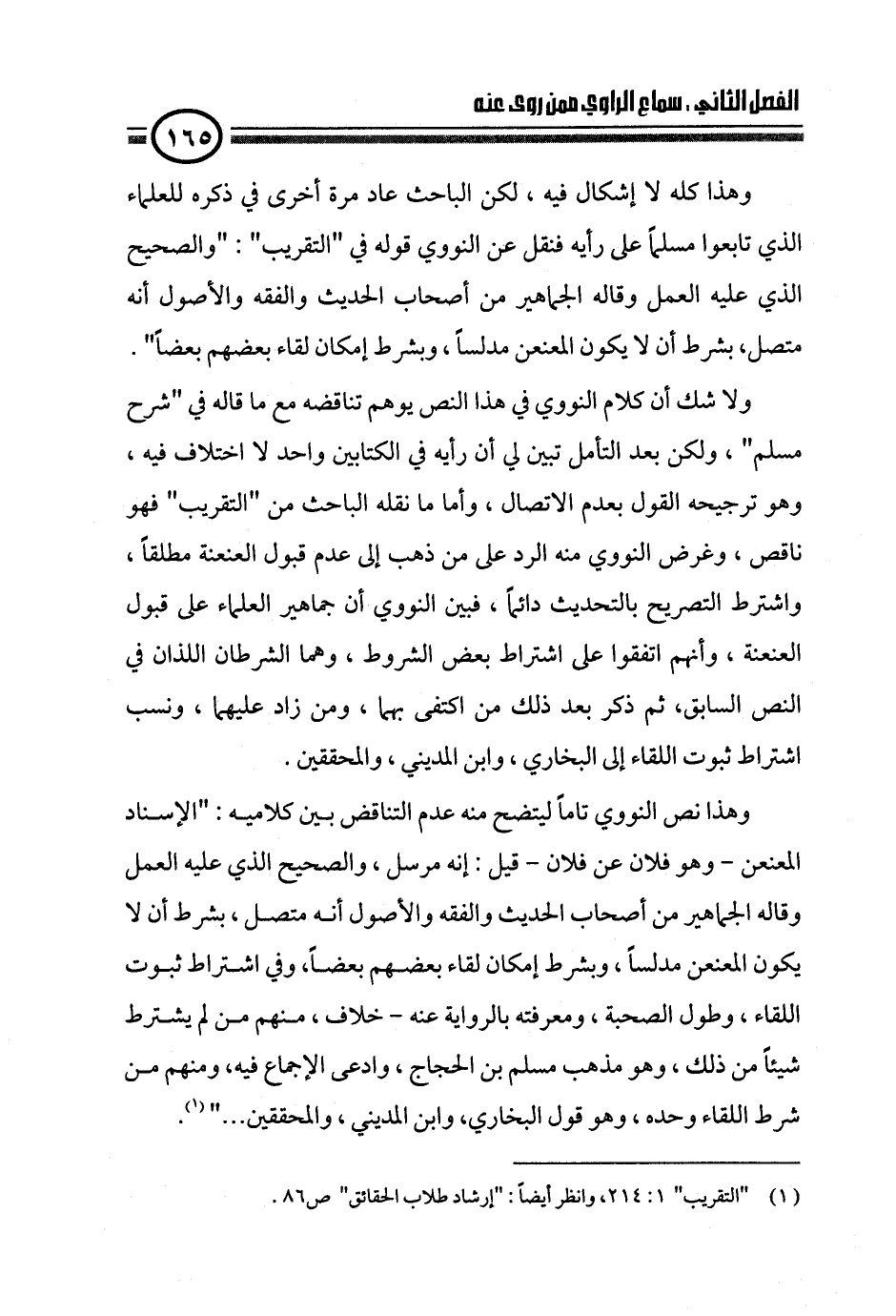 وهذا كله لا إشكال فيه، لكن الباحث عاد مرة أخرى في ذكره للعلماء الذي تابعوا مسلماً على رأيه فنقل عن النووي قوله في "التقريب": "والصحيح الذي عليه العمل وقاله الجماهير من أصحاب الحديث والفقه والأصول أنه متصل، بشرط أن لا يكون المعنعن مدلساً، وبشرط إمكان لقاء بعضهم بعضاً".