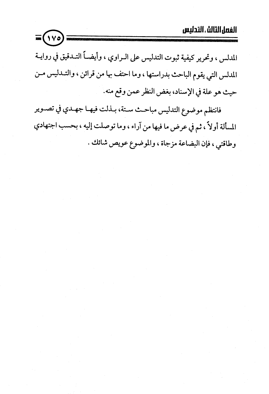 فانتظم موضوع التدليس مباحث ستة، بذلت فيها جهدي في تصوير المسألة أولاً، ثم في عرض ما فيها من آراء، وما توصلت إليه، بحسب اجتهادي وطاقتي، فإن البضاعة مزجاة، والموضوع عويص شائك.