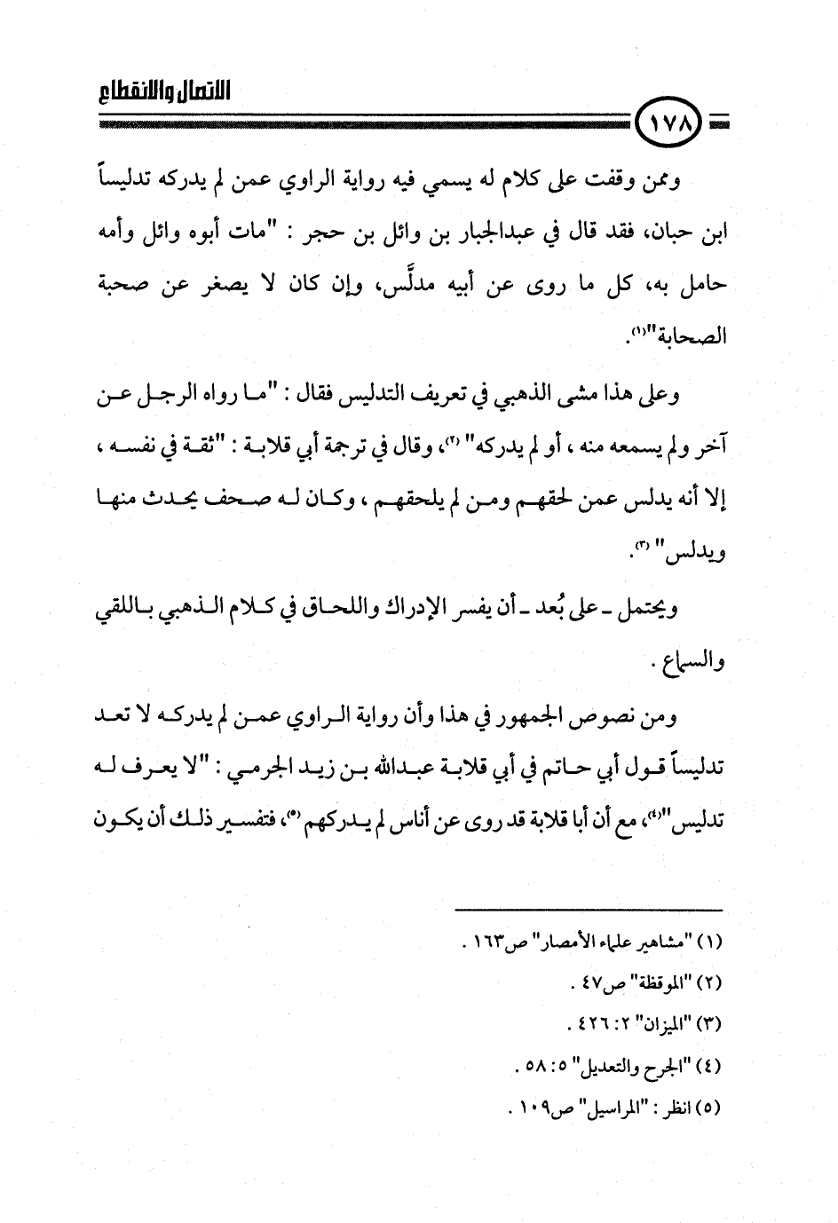 ومن نصوص الجمهور في هذا وأن رواية الراوي عمن لم يدركه لا تعد تدليساً قول أبي حاتم في أبي قلابة عبدالله بن زيد الجرمي: "لا يعرف له تدليس" (¬٤)، مع أن أبا قلابة قد روى عن أناس لم يدركهم (¬٥)، فتفسير ذلك أن يكون