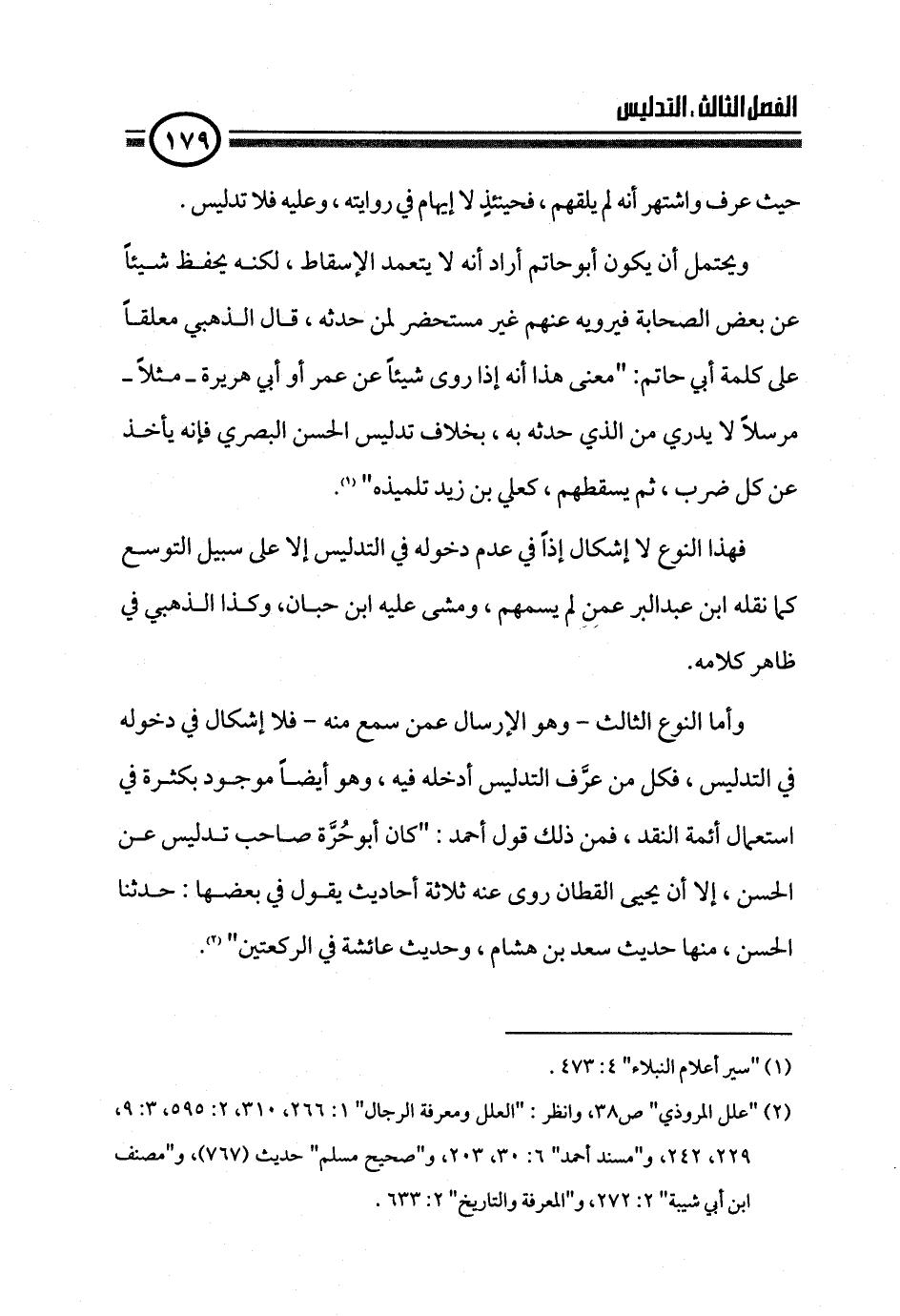 وأما النوع الثالث - وهو الإرسال عمن سمع منه - فلا إشكال في دخوله في التدليس، فكل من عرَّف التدليس أدخله فيه، وهو أيضاً موجود بكثرة في استعمال أئمة النقد، فمن ذلك قول أحمد: "كان أبوحُرَّة صاحب تدليس عن الحسن، إلا أن يحيى القطان روى عنه ثلاثة أحاديث يقول في بعضها: حدثنا الحسن، منها حديث سعد بن هشام، وحديث عائشة في الركعتين" (¬٢).