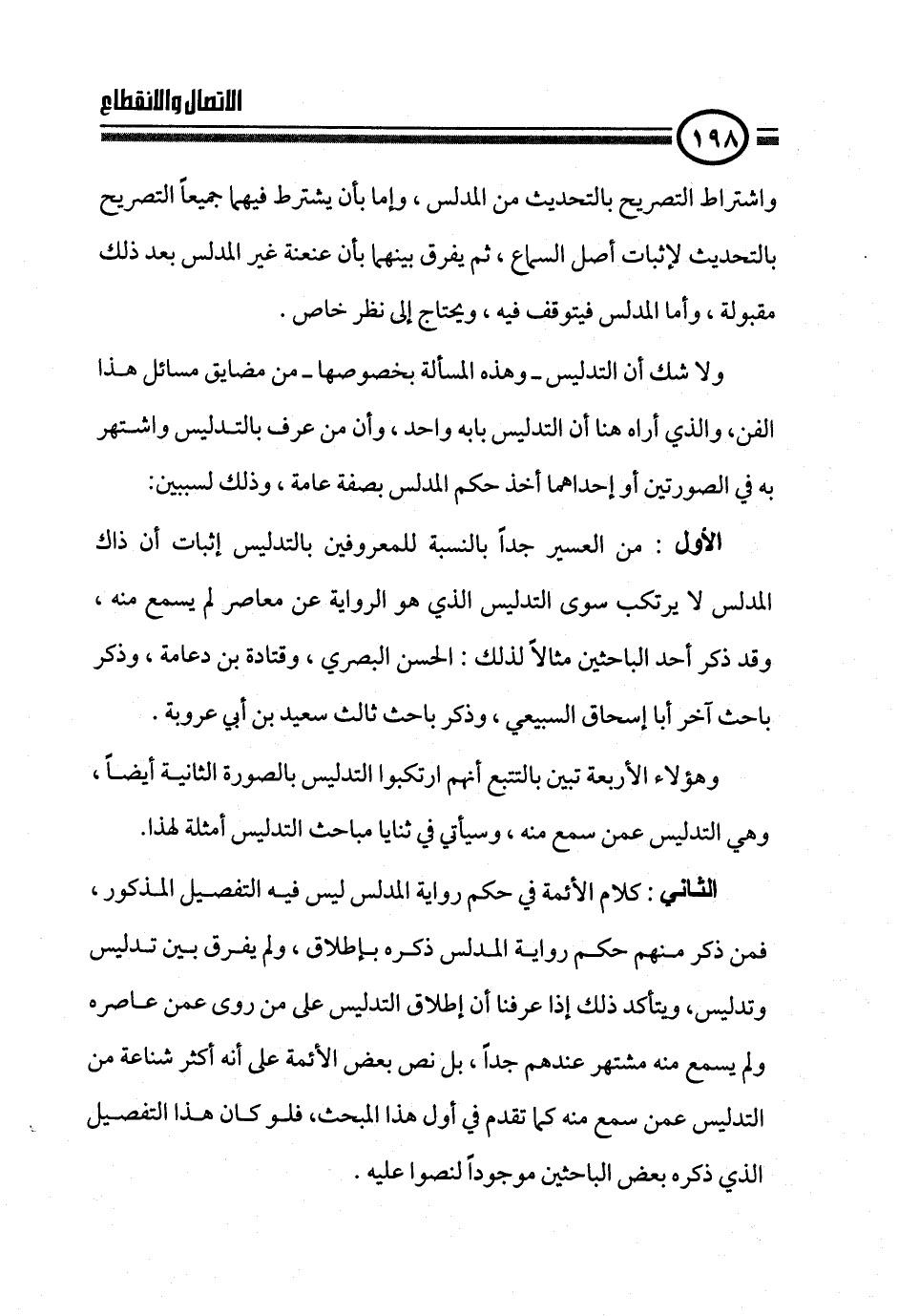 الثاني: كلام الأئمة في حكم رواية المدلس ليس فيه التفصيل المذكور، فمن ذكر منهم حكم رواية المدلس ذكره بإطلاق، ولم يفرق بين تدليس وتدليس، ويتأكد ذلك إذا عرفنا أن إطلاق التدليس على من روى عمن عاصره ولم يسمع منه مشتهر عندهم جداً، بل نص بعض الأئمة على أنه أكثر شناعة من التدليس عمن سمع منه كما تقدم في أول هذا المبحث، فلو كان هذا التفصيل الذي ذكره بعض الباحثين موجوداً لنصوا عليه.