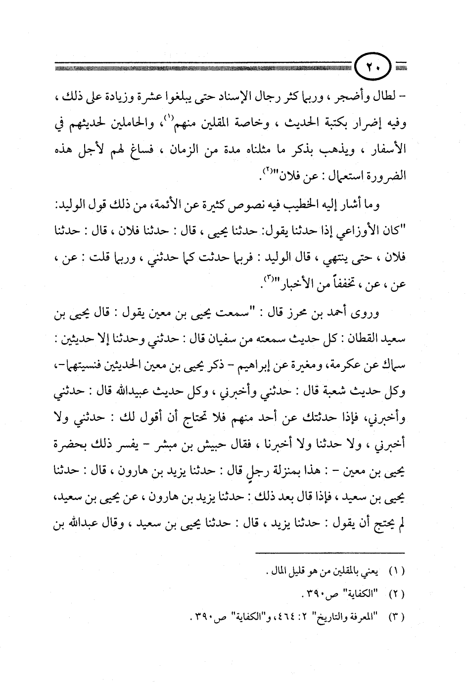 وما أشار إليه الخطيب فيه نصوص كثيرة عن الأئمة، من ذلك قول الوليد: "كان الأوزاعي إذا حدثنا يقول: حدثنا يحيى، قال: حدثنا فلان، قال: حدثنا فلان، حتى ينتهي، قال الوليد: فربما حدثت كما حدثني، وربما قلت: عن، عن، عن، تخففاً من الأخبار" (¬٣).