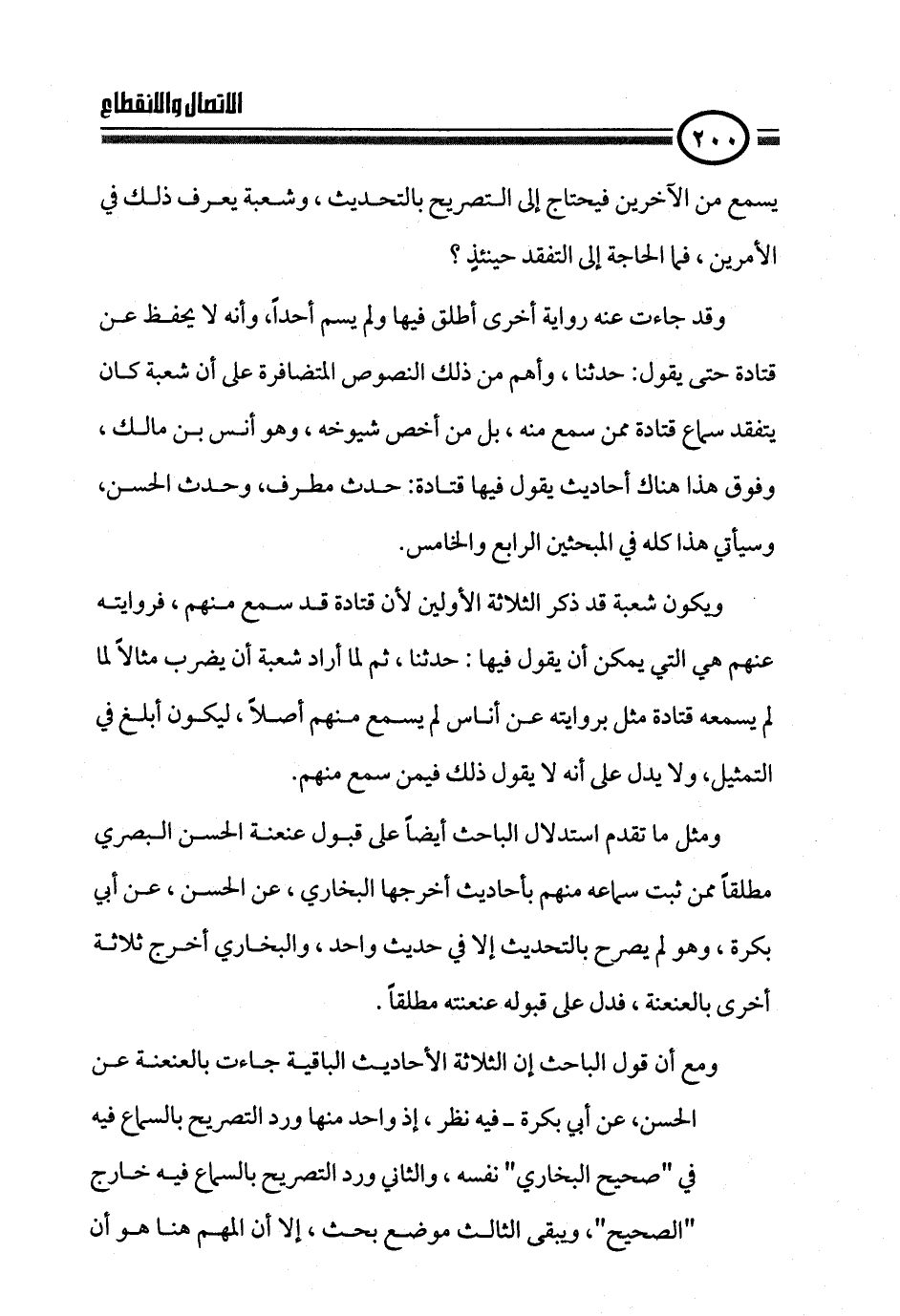 ومثل ما تقدم استدلال الباحث أيضاً على قبول عنعنة الحسن البصري مطلقاً ممن ثبت سماعه منهم بأحاديث أخرجها البخاري، عن الحسن، عن أبي بكرة، وهو لم يصرح بالتحديث إلا في حديث واحد، والبخاري أخرج ثلاثة أخرى بالعنعنة، فدل على قبوله عنعنته مطلقاً.