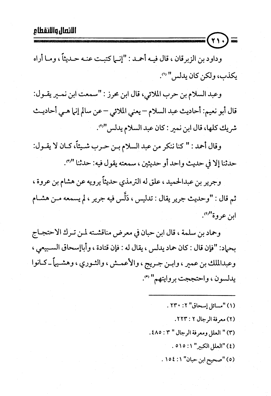 وحماد بن سلمة، قال ابن حبان في معرض مناقشته لمن ترك الاحتجاج بحماد: "فإن قال: كان حماد يدلس، يقال له: فإن قتادة، وأباإسحاق السبيعي، وعبدالملك بن عمير، وابن جريج، والأعمش، والثوري، وهشيماً ـ كانوا يدلسون، واحتججت بروايتهم" (¬٥).
