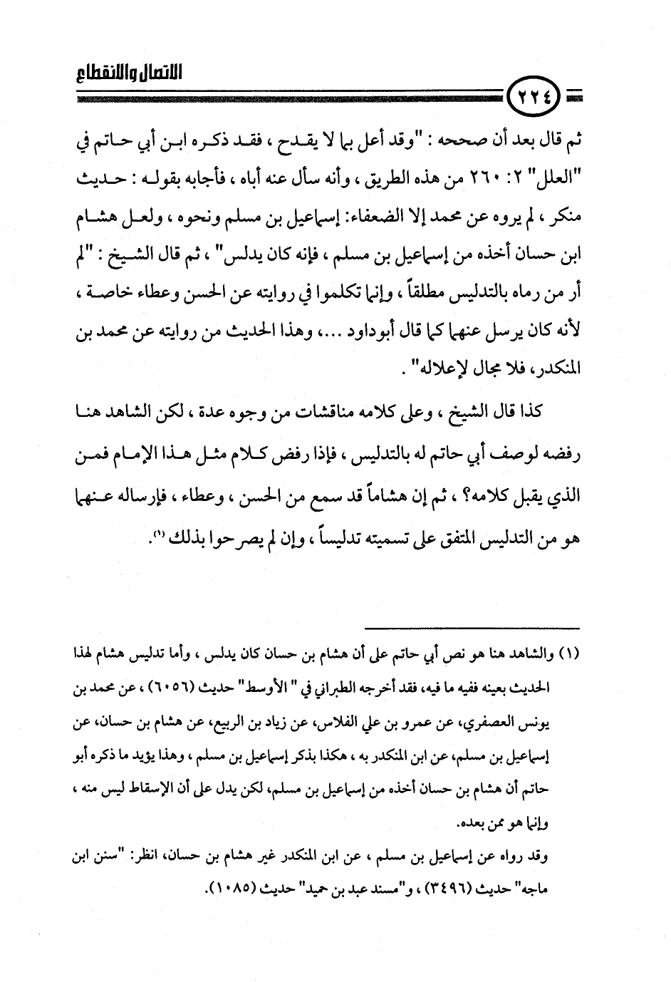 (¬١) والشاهد هنا هو نص أبي حاتم على أن هشام بن حسان كان يدلس، وأما تدليس هشام لهذا الحديث بعينه ففيه ما فيه، فقد أخرجه الطبراني في " الأوسط" حديث (٦٠٥٦)، عن محمد بن يونس العصفري، عن عمرو بن علي الفلاس، عن زياد بن الربيع، عن هشام بن حسان، عن إسماعيل بن مسلم، عن ابن المنكدر به، هكذا بذكر إسماعيل بن مسلم، وهذا يؤيد ما ذكره أبو حاتم أن هشام بن حسان أخذه من إسماعيل بن مسلم، لكن يدل على أن الإسقاط ليس منه، وإنما هو ممن بعده.