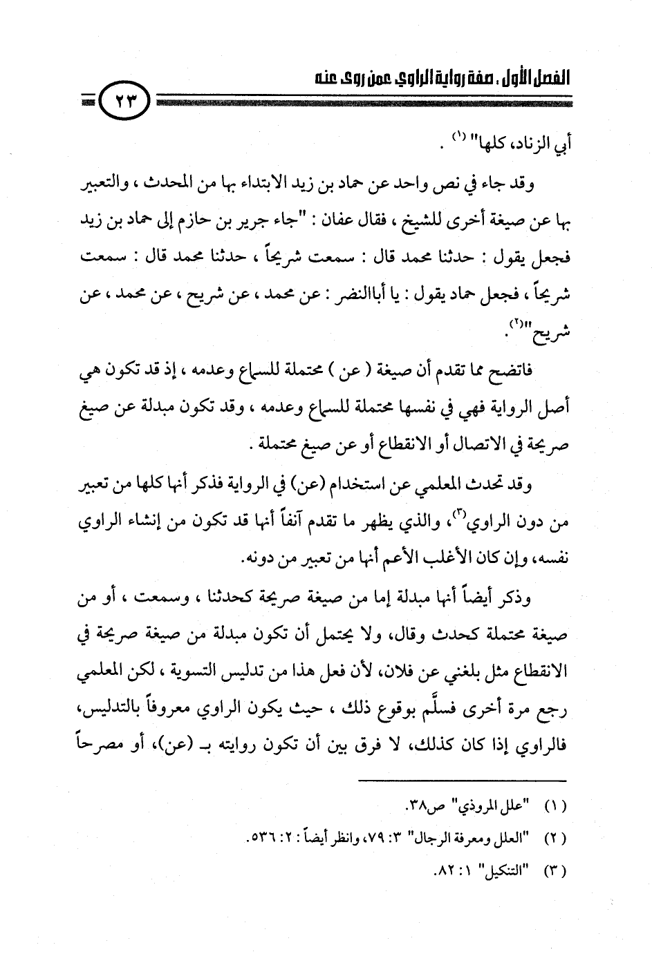 وقد تحدث المعلمي عن استخدام (عن) في الرواية فذكر أنها كلها من تعبير من دون الراوي (¬٣)، والذي يظهر ما تقدم آنفاً أنها قد تكون من إنشاء الراوي نفسه، وإن كان الأغلب الأعم أنها من تعبير من دونه.