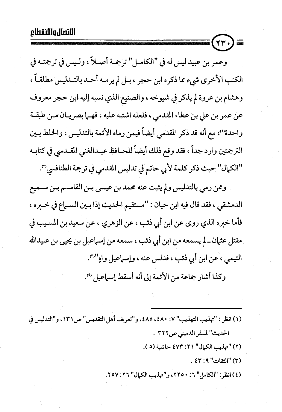 وعمر بن عبيد ليس له في "الكامل" ترجمة أصلاً، وليس في ترجمته في الكتب الأخرى شيء مما ذكره ابن حجر، بل لم يرمه أحد بالتدليس مطلقاً، وهشام بن عروة لم يذكر في شيوخه، والصنيع الذي نسبه إليه ابن حجر معروف عن عمر بن علي بن عطاء المقدمي، فلعله اشتبه عليه، فهما بصريان من طبقة واحدة (¬١)، مع أنه قد ذكر المقدمي أيضاً فيمن رماه الأئمة بالتدليس، والخلط بين الترجمتين وارد جداً، فقد وقع ذلك أيضاً للحافظ عبدالغني المقدسي في كتابه "الكمال" حيث ذكر كلمة لأبي حاتم في تدليس المقدمي في ترجمة الطنافسي (¬٢).