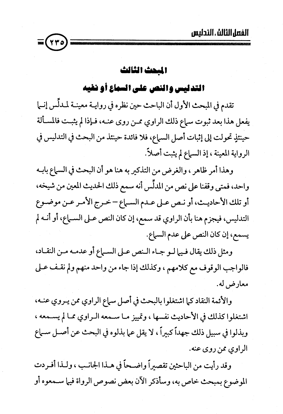 وهذا أمر ظاهر، والغرض من التذكير به هنا هو أن البحث في السماع بابه واحد، فمتى وقفنا على نص من المدلِّس أنه سمع ذلك الحديث المعين من شيخه، أو تلك الأحاديث، أو نص على عدم السماع - خرج الأمر عن موضوع التدليس، فيجزم هنا بأن الراوي قد سمع، إن كان النص على السماع، أو أنه لم يسمع، إن كان النص على عدم السماع.