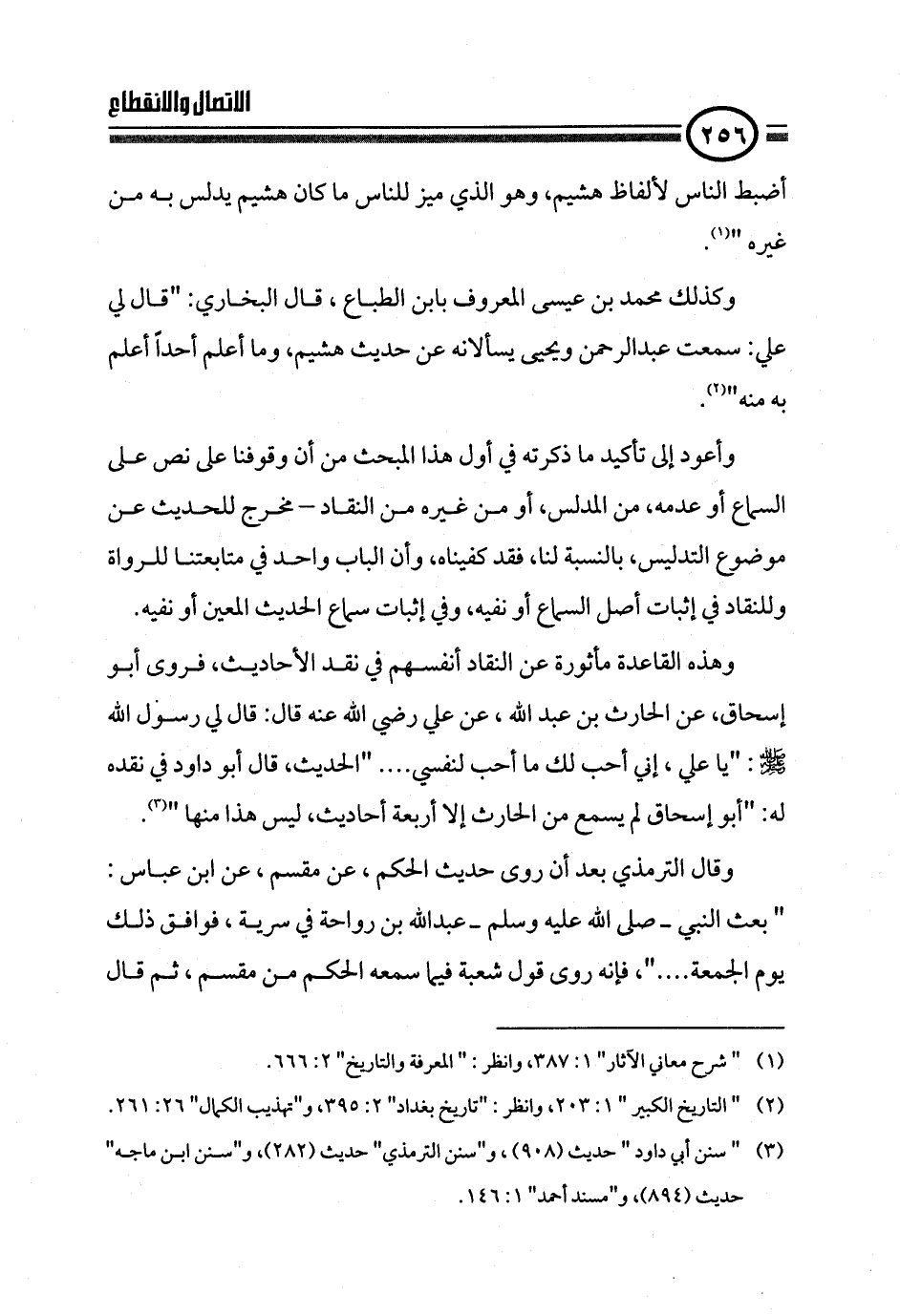 وهذه القاعدة مأثورة عن النقاد أنفسهم في نقد الأحاديث، فروى أبو إسحاق، عن الحارث بن عبد الله، عن علي رضي الله عنه قال: قال لي رسول الله - صلى الله عليه وسلم -: "يا علي، إني أحب لك ما أحب لنفسي .... "الحديث، قال أبو داود في نقده له: "أبو إسحاق لم يسمع من الحارث إلا أربعة أحاديث، ليس هذا منها " (¬٣).
