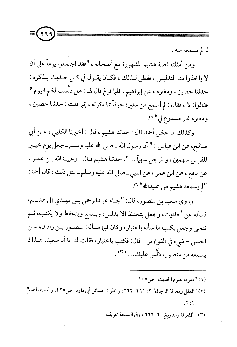 وروى سعيد بن منصور، قال: "جاء عبدالرحمن بن مهدي إلى هشيم، فسأله عن أحاديث، وجعل يتحفظ ألا يدلس، ويسمع ويتحفظ ولا يكتب، ثم تنحى وجعل يكتب ما سأله باختيار، وكان فيما سأله: منصور بن زاذان، عن الحسن - شيء في القوارير - قال: فكتب باختيار، فقلت له: يا أبا سعيد، هذا لم يسمعه من منصور، دَلَّس عليك ... " (¬٣).