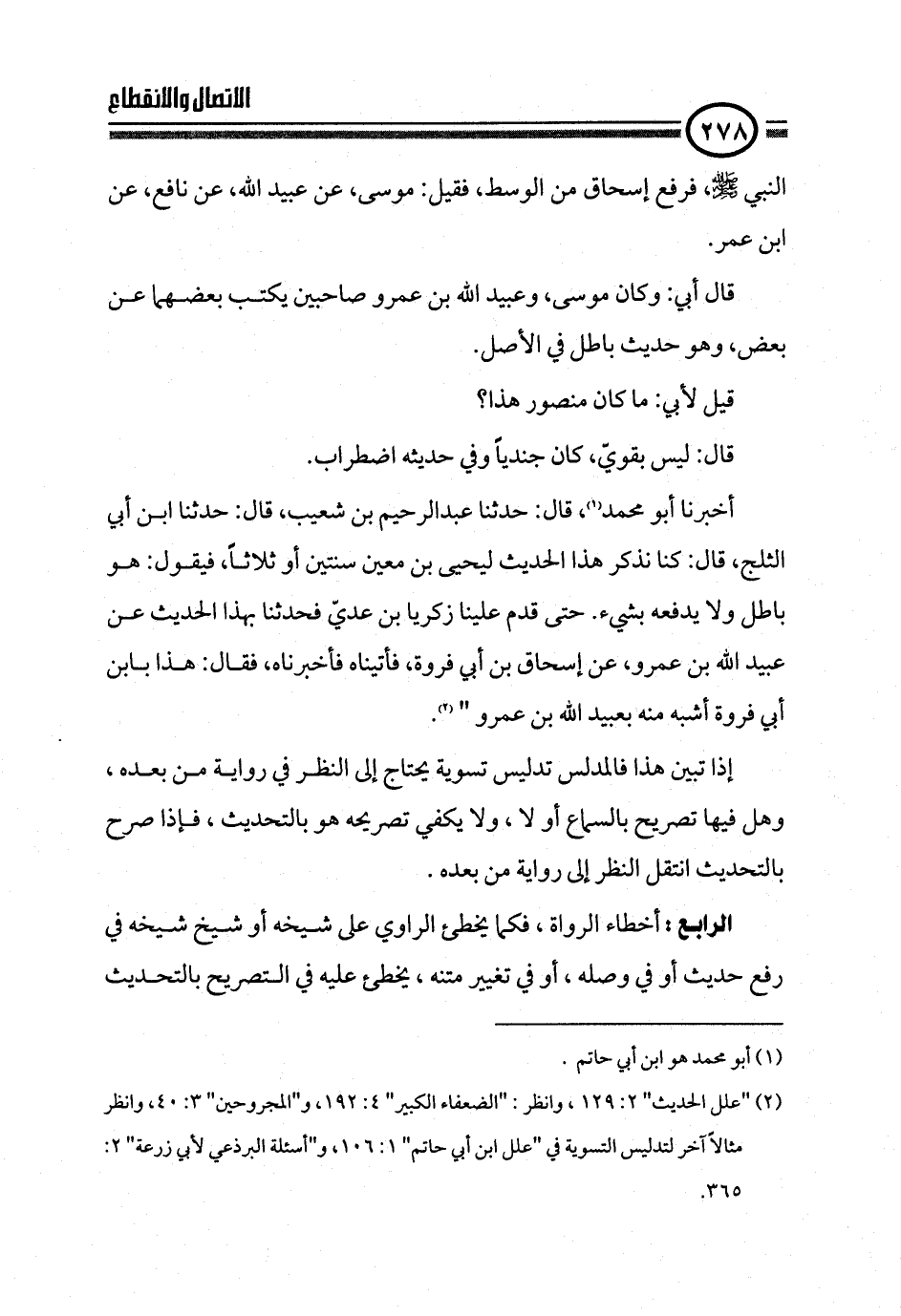 (¬٢) "علل الحديث" ٢: ١٢٩، وانظر: "الضعفاء الكبير" ٤: ١٩٢، و"المجروحين" ٣: ٤٠، وانظر مثالاً آخر لتدليس التسوية في "علل ابن أبي حاتم" ١: ١٠٦، و"أسئلة البرذعي لأبي زرعة" ٢: ٣٦٥.