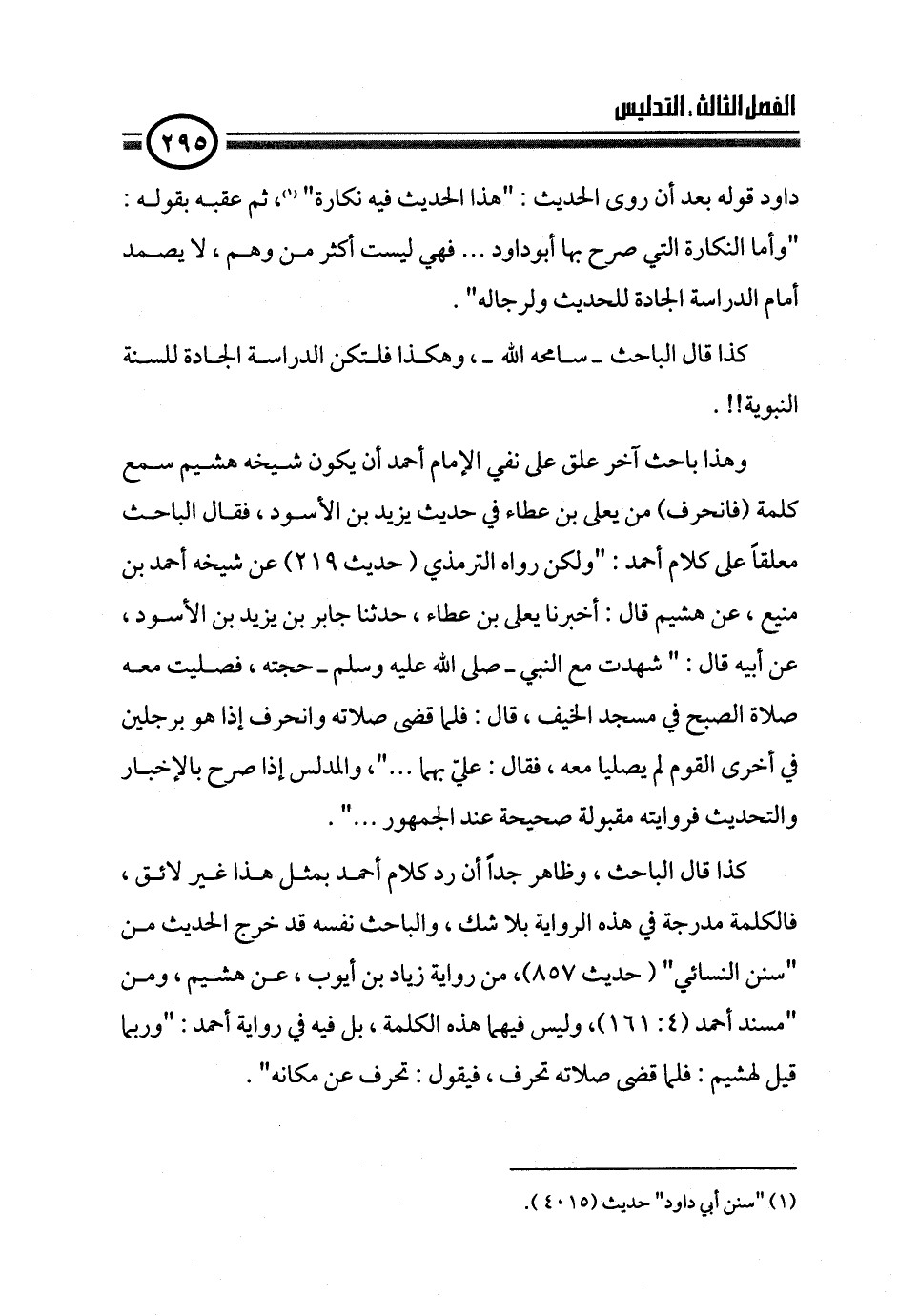 وهذا باحث آخر علق على نفي الإمام أحمد أن يكون شيخه هشيم سمع كلمة (فانحرف) من يعلى بن عطاء في حديث يزيد بن الأسود، فقال الباحث معلقاً على كلام أحمد: "ولكن رواه الترمذي (حديث ٢١٩) عن شيخه أحمد بن منيع، عن هشيم قال: أخبرنا يعلى بن عطاء، حدثنا جابر بن يزيد بن الأسود، عن أبيه قال: " شهدت مع النبي ـ صلى الله عليه وسلم ـ حجته، فصليت معه صلاة الصبح في مسجد الخيف، قال: فلما قضى صلاته وانحرف إذا هو برجلين في أخرى القوم لم يصليا معه، فقال: عليّ بهما ... "، والمدلس إذا صرح بالإخبار والتحديث فروايته مقبولة صحيحة عند الجمهور ... ".