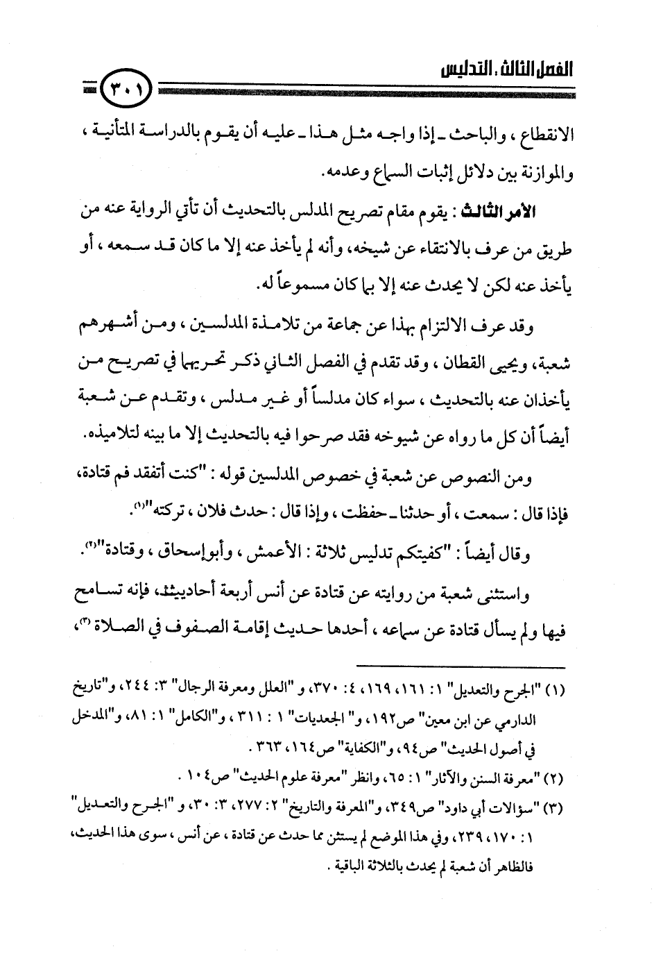 ومن النصوص عن شعبة في خصوص المدلسين قوله: "كنت أتفقد فم قتادة، فإذا قال: سمعت، أو حدثنا ـ حفظت، وإذا قال: حدث فلان، تركته" (¬١).