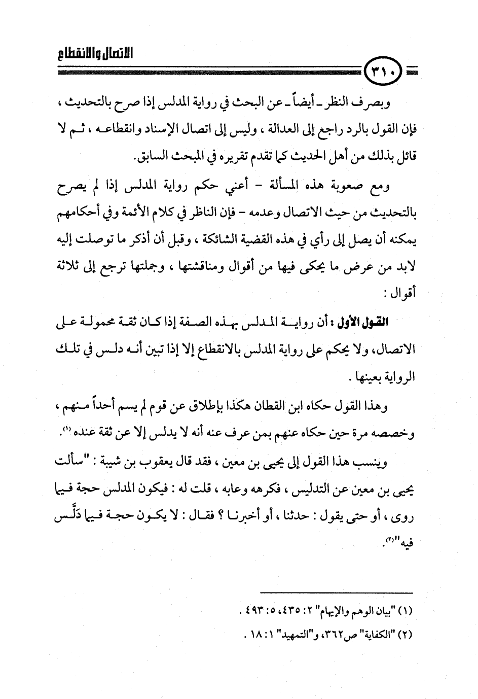 وهذا القول حكاه ابن القطان هكذا بإطلاق عن قوم لم يسم أحداً منهم، وخصصه مرة حين حكاه عنهم بمن عرف عنه أنه لا يدلس إلا عن ثقة عنده (¬١).