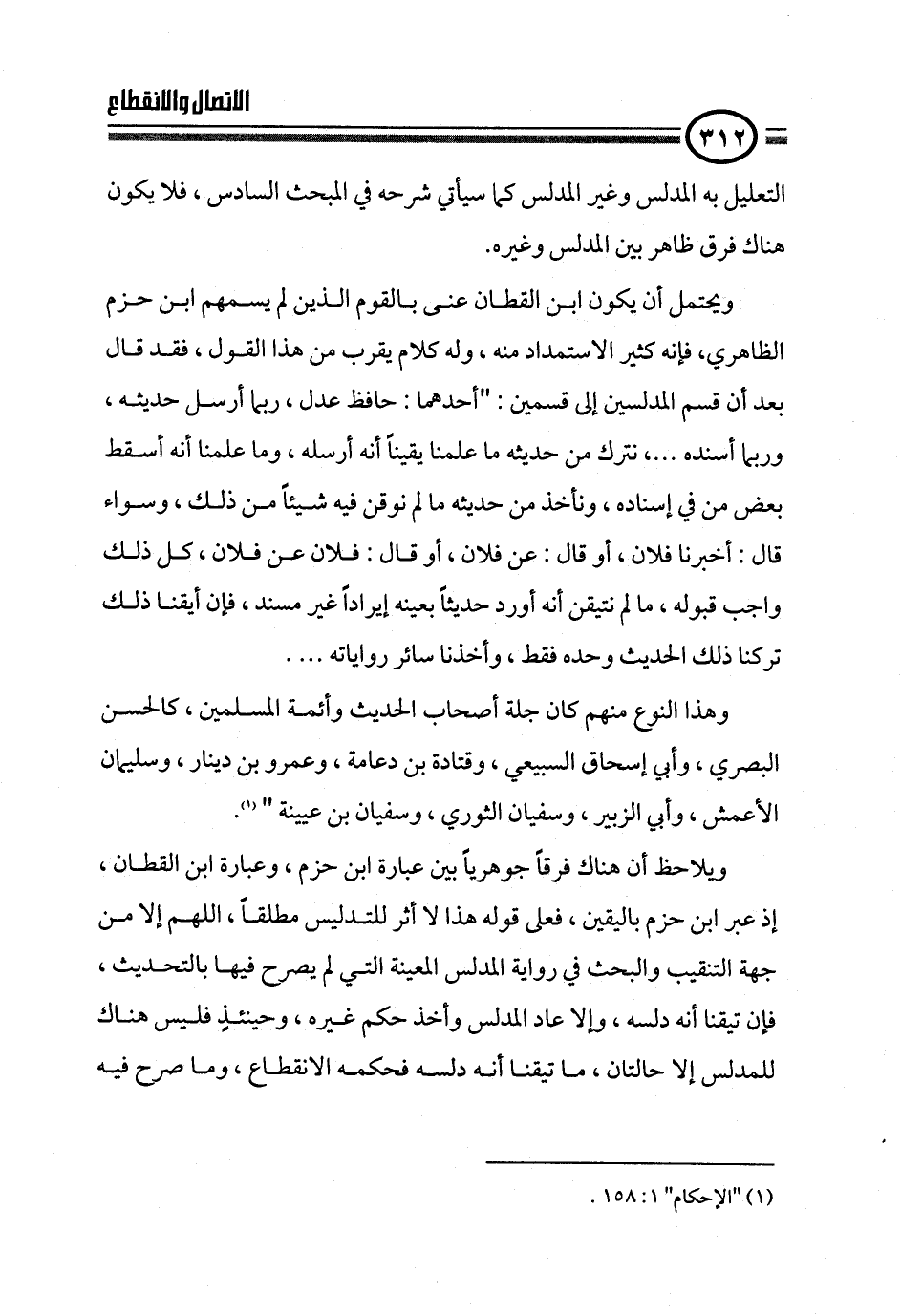 ويحتمل أن يكون ابن القطان عنى بالقوم الذين لم يسمهم ابن حزم الظاهري، فإنه كثير الاستمداد منه، وله كلام يقرب من هذا القول، فقد قال بعد أن قسم المدلسين إلى قسمين: "أحدهما: حافظ عدل، ربما أرسل حديثه، وربما أسنده ... ، نترك من حديثه ما علمنا يقيناً أنه أرسله، وما علمنا أنه أسقط بعض من في إسناده، ونأخذ من حديثه ما لم نوقن فيه شيئاً من ذلك، وسواء قال: أخبرنا فلان، أو قال: عن فلان، أو قال: فلان عن فلان، كل ذلك واجب قبوله، ما لم نتيقن أنه أورد حديثاً بعينه إيراداً غير مسند، فإن أيقنا ذلك تركنا ذلك الحديث وحده فقط، وأخذنا سائر رواياته ... .
