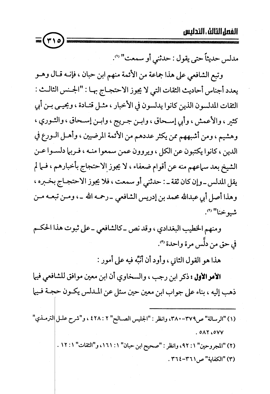 وتبع الشافعي على هذا جماعة من الأئمة منهم ابن حبان، فإنه قال وهو يعدد أجناس أحاديث الثقات التي لا يجوز الاحتجاج بها: "الجنس الثالث: الثقات المدلسون الذين كانوا يدلسون في الأخبار، مثل قتادة، ويحيى بن أبي كثير، والأعمش، وأبي إسحاق، وابن جريج، وابن إسحاق، والثوري، وهشيم، ومن أشبههم ممن يكثر عددهم من الأئمة المرضيين، وأهل الورع في الدين، كانوا يكتبون عن الكل، ويروون عمن سمعوا منه، فربما دلسوا عن الشيخ بعد سماعهم منه عن أقوام ضعفاء، لا يجوز الاحتجاج بأخبارهم، فما لم يقل المدلس ـ وإن كان ثقة ـ: حدثني أو سمعت، فلا يجوز الاحتجاج بخبره، وهذا أصل أبي عبدالله محمد بن إدريس الشافعي ـ رحمه الله ـ، ومن تبعه من شيوخنا" (¬٢).