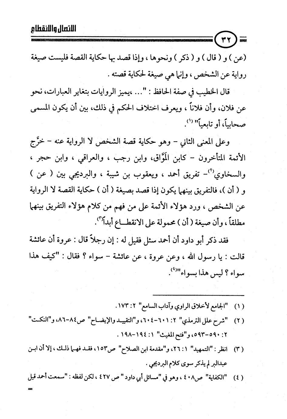 و(أن)، فالتفريق بينهما يكون إذا قصد بصيغة (أن) حكاية القصة لا الرواية عن الشخص، ورد هؤلاء الأئمة على من فهم من كلام هؤلاء التفريق بينهما مطلقاً، وأن صيغة (أن) محمولة على الانقطاع أبداً (¬٣).